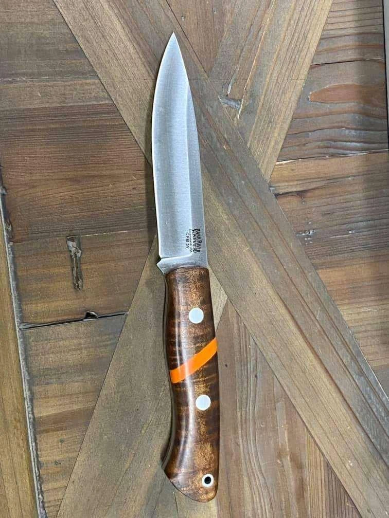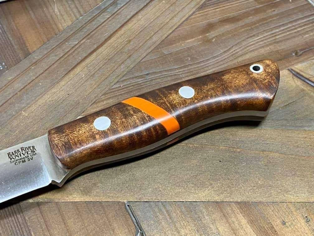 This wildly popular Bark River Aurora CPM 3V Knife has a beautiful dark curly maple handles with a unique orange spacer!
