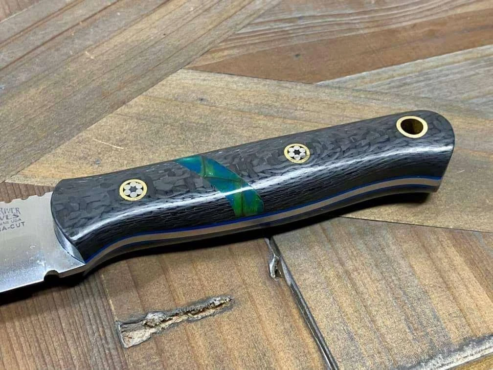 This Bushcraft Scout Knife has ultra premium MagnaCut stainless steel blade with beautiful and unique carbon fiber handles with borealis spacer centered around blue liners and mosaic pins!
