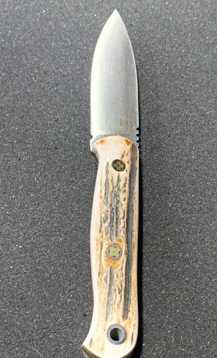 This Bushcraft Scout Knife has ultra premium MagnaCut stainless steel blade with beautiful and unique Elk handles centered around black liners and mosaic pins!