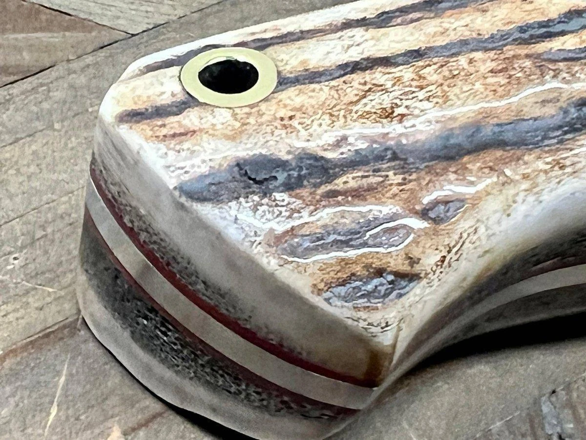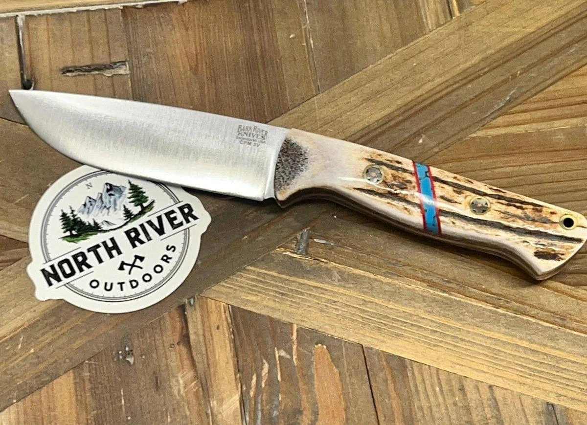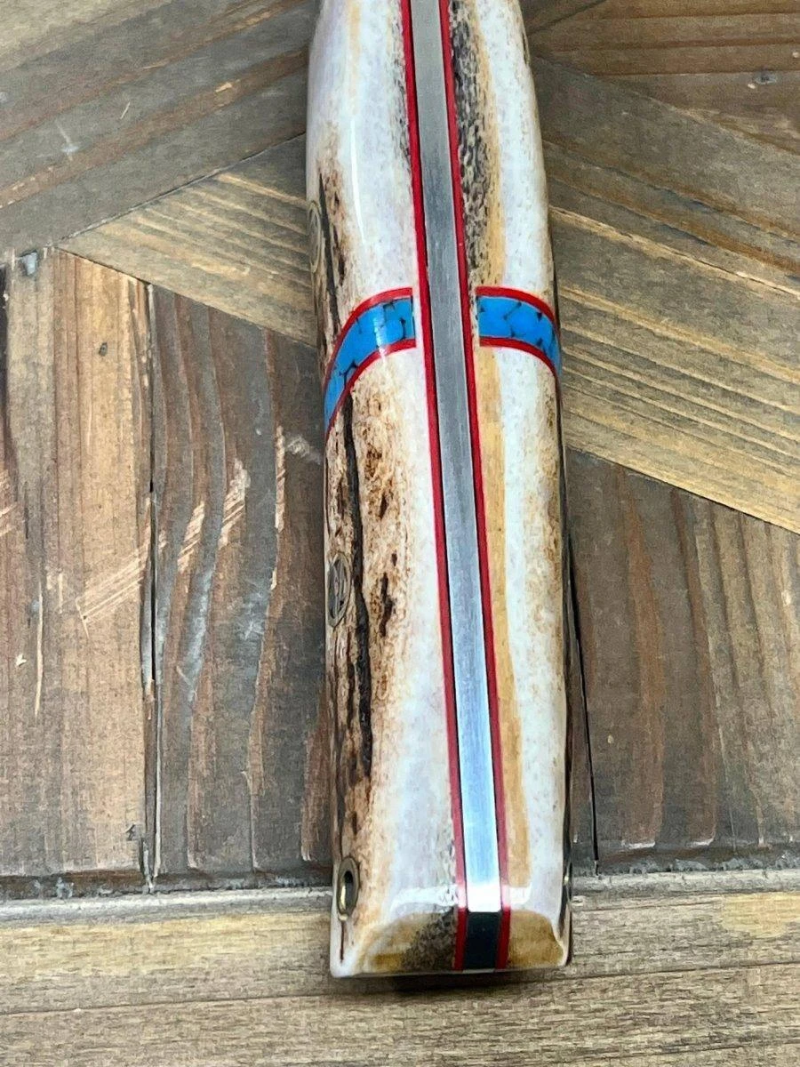 This popular Bark River Fox River EXT-2 LT 3V Knife comes with Elk and Turquoise Spacer with red liners and mosaic pins!