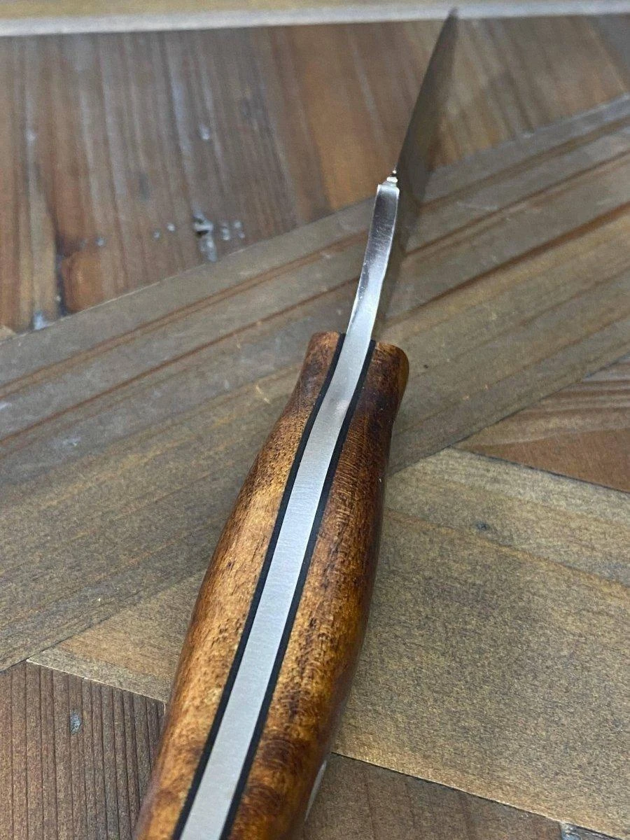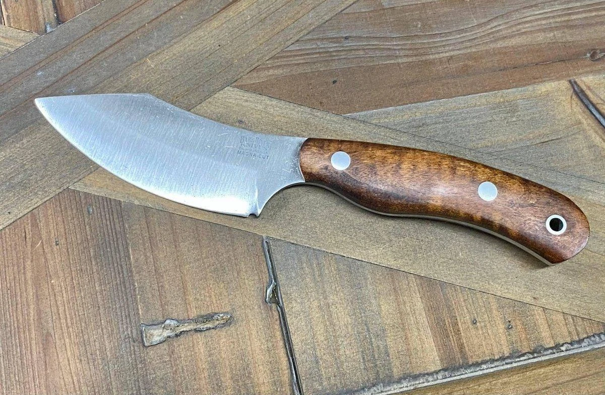 This beautiful Bark River JX6 comes with ultra premium MagnaCut blade steel and a beautiful dark curly maple handles centered with black liners!