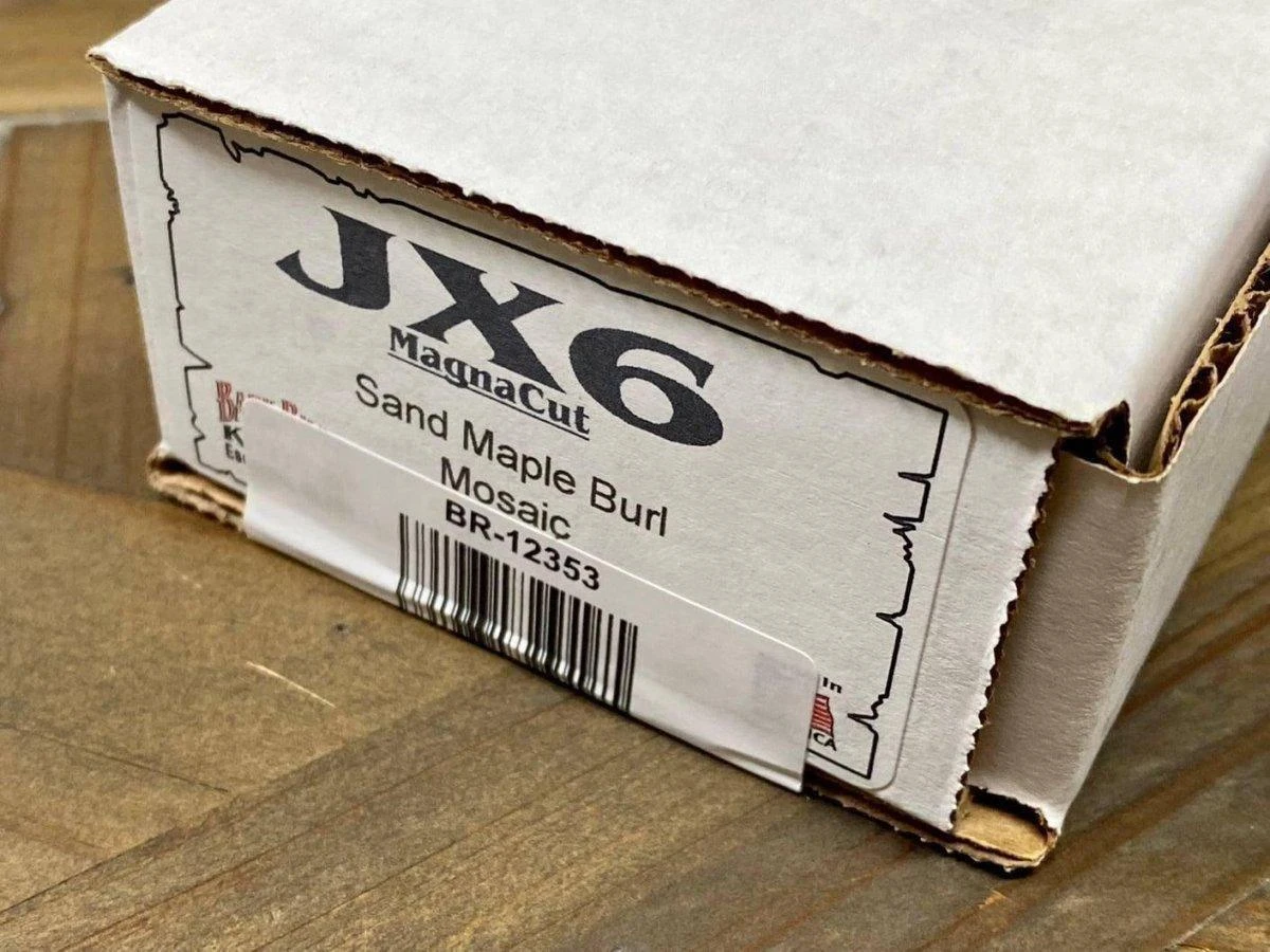 This Bark River JX6 comes with ultra premium MagnaCut blade steel with beautiful sand maple burl and unique mosaic pins!
