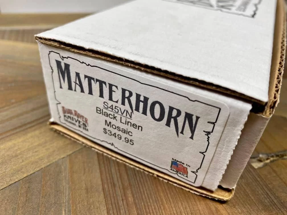 This beautiful Bark River Matterhorn Knife features the popular CPM-S45VN stainless steel blade with black linen micarta handle and mosaic pins to give this knife a truly unique look and feel. The pictures you’re viewing are the actual Bark River Matterhorn knife you will be receiving. Quantities Limited.