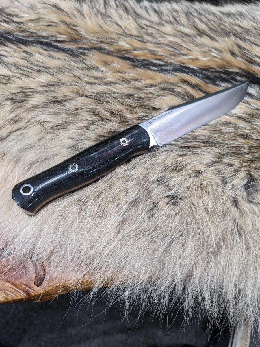 This unique handmade Bark River Ultra Lite Field Knife comes in the ultra-tough CPM 3V steel with a black burlap handles and orange liners with decorative mosaic pins. Picture shown is the actual knife you will received.