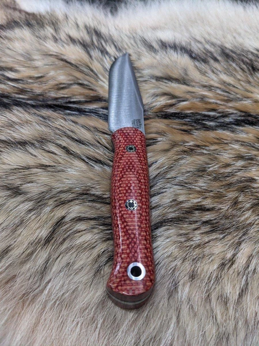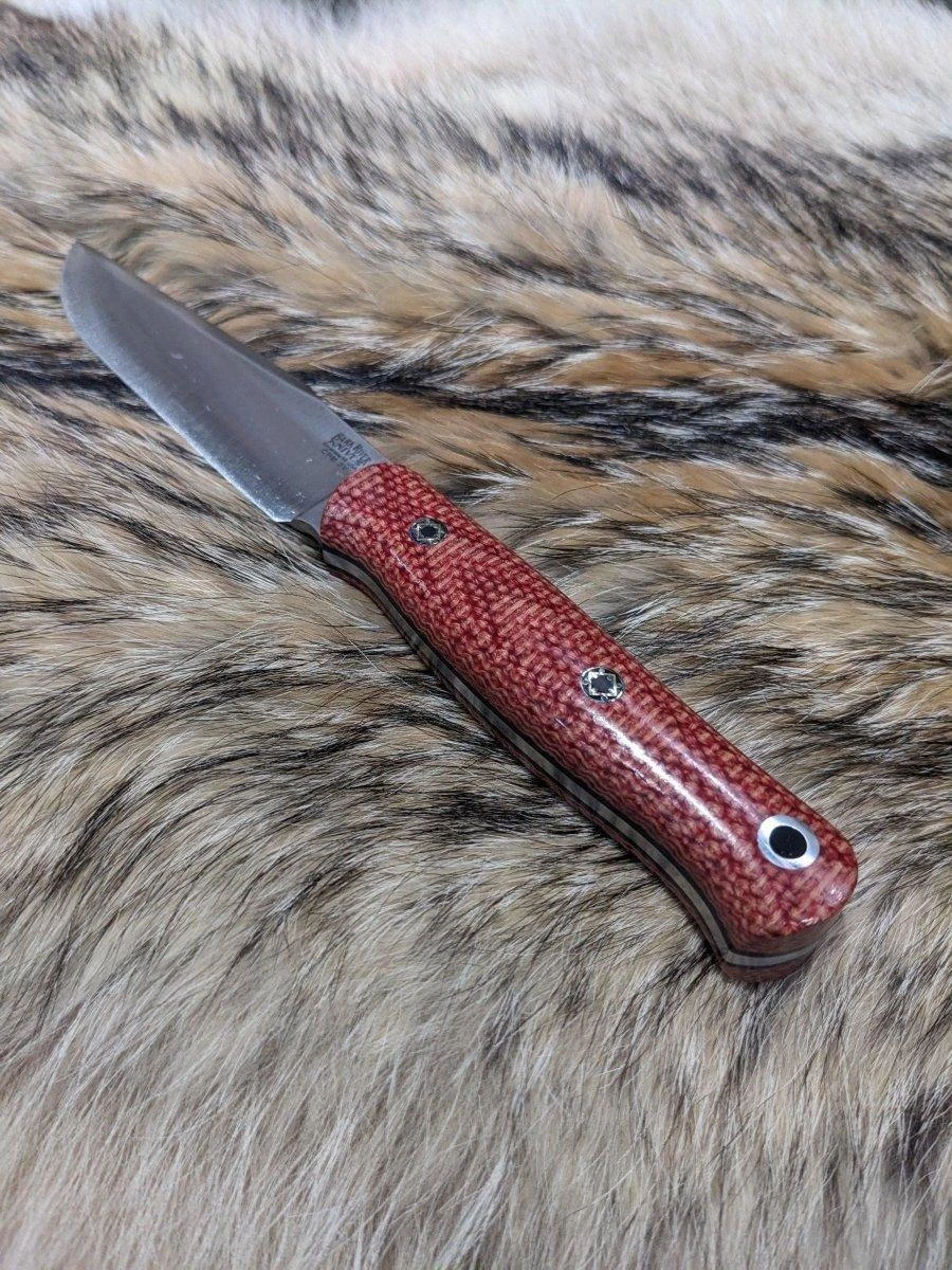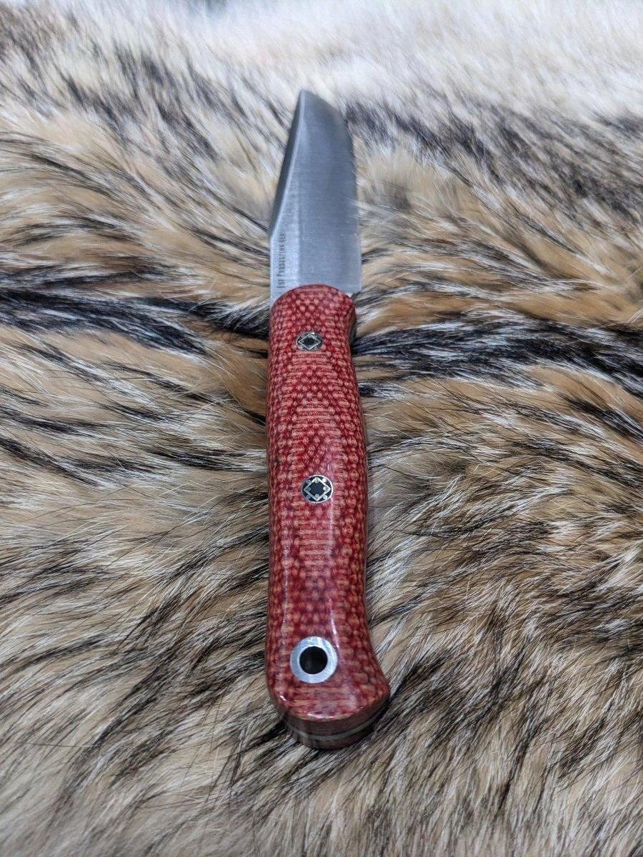 This unique handmade Bark River Ultra Lite Field Knife comes in the ultra-tough CPM 3V steel with a firedog canvas handles, thick black liners with decorative mosaic pins. Picture shown is the actual knife you will received.