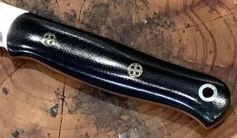 This unique handmade Ultralite Bushcrafter comes in premium CPM 3V stainless steel with a beautiful black canvas micarta handles and red liners with decorative mosaic pins. Picture shown is the actual knife received.
