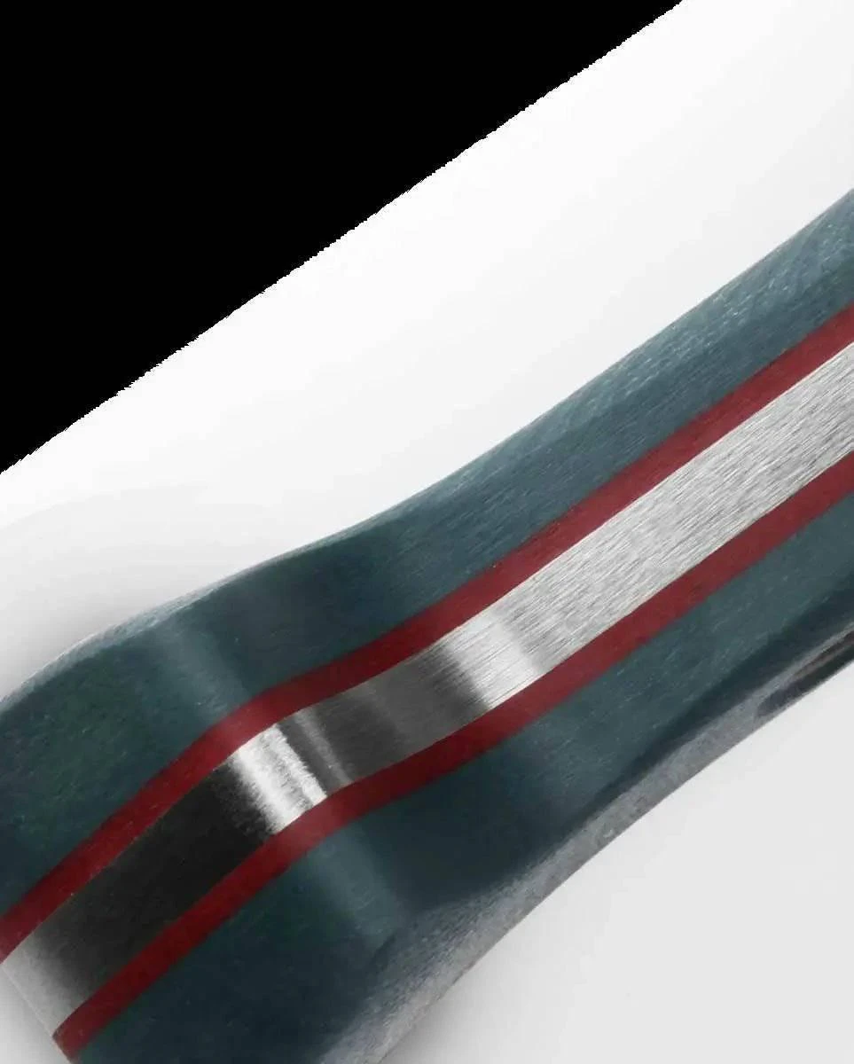 - Hand-blended and contoured green G10 handles with red vulcanized spacer held together with pressed titanium tubing