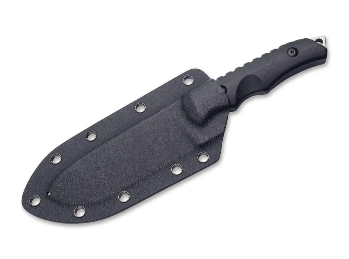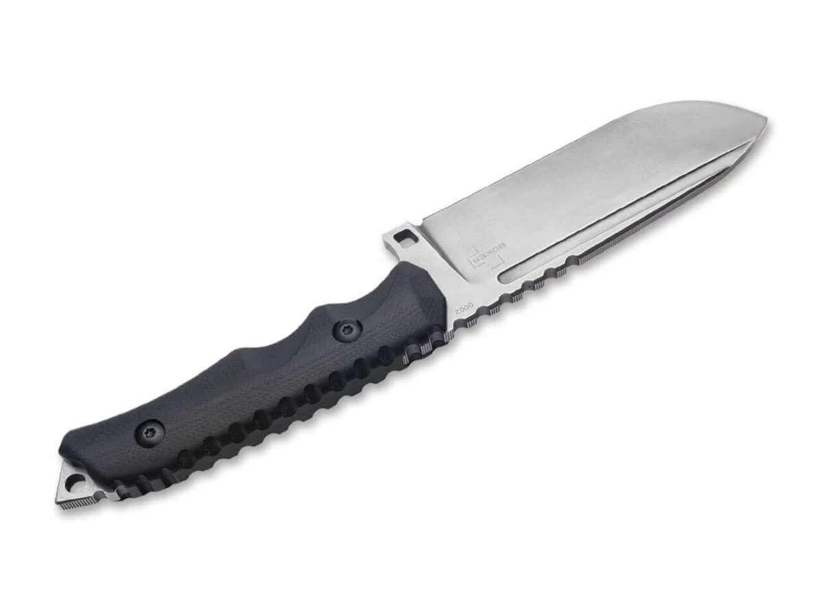With the Boker Plus Hermod 2.0, he presents another practical outdoor knife for which alternative handle scales in a wide variety of shapes, colors, and materials can be easily printed out yourself. The Hermod 2.0, which is also designed as a rescue and survival knife, has a stonewash blade made of D2 and a full tang construction. The high bevel ensures good cutting properties despite the solid blade. The contoured handle scales made of black G10 are ergonomically shaped and give the hand an excellent grip, even in cold conditions or when used with gloves. Distinctive jimpings in the thumb rest area and at the end of the handle further increase work safety. Supplied with a glass breaker, a lanyard hole, a custom-fit Kydex sheath, and a practical belt adapter.