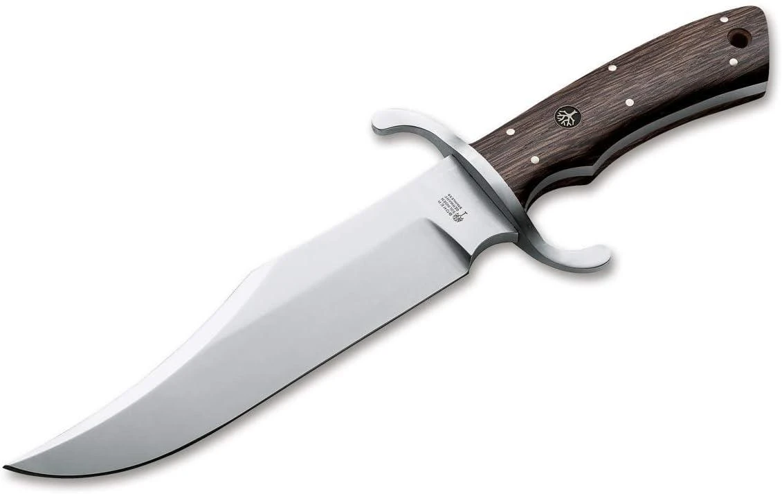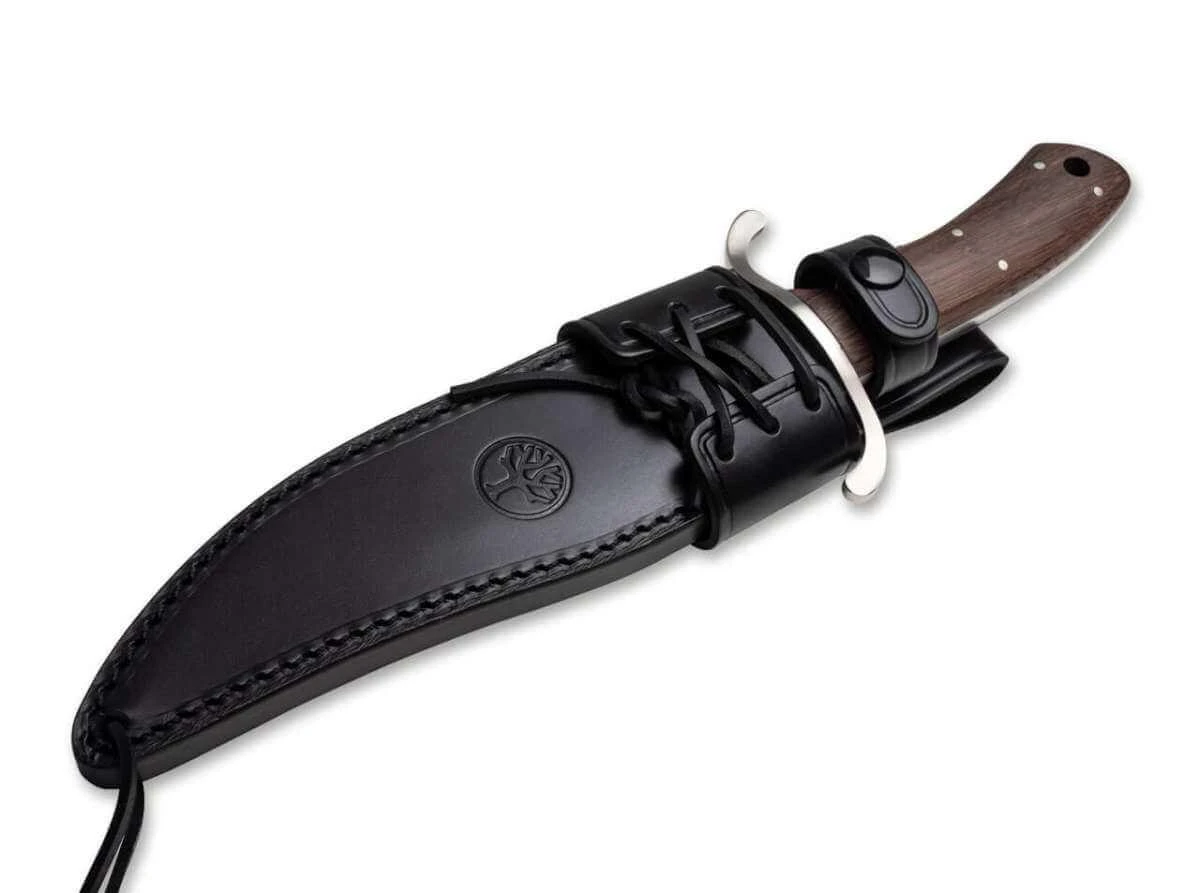 The Boker Bowie Fixed Blade Knife features a faithful design based on the early 19th century, complete with a sturdy 0.25″ thick nitrogen-alloyed Bohler N690 steel blade. The knife is named after legendary pioneer and soldier, James “Jim” Bowie, who is praised as a hero of the Wild West. Unlike the often imitated Sheffield Bowie, this outdoor knife stays true to the original American Bowie, showcasing a stainless steel crossguard with a sleek satin finish. It also comes with a premium black leather sheath inspired by the original design.