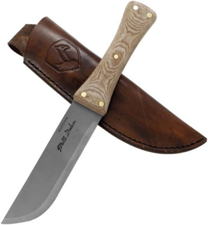 The Primitive Camp Knife features a 5.875″ blasted 1095 high carbon steel blade. Every edge is hand finished and honed to razor sharpness. The Micarta handles enhance both the look and function of this knife while delivering durable phenolic performance. The included sheath is made from high quality, heavy duty, handcrafted leather.