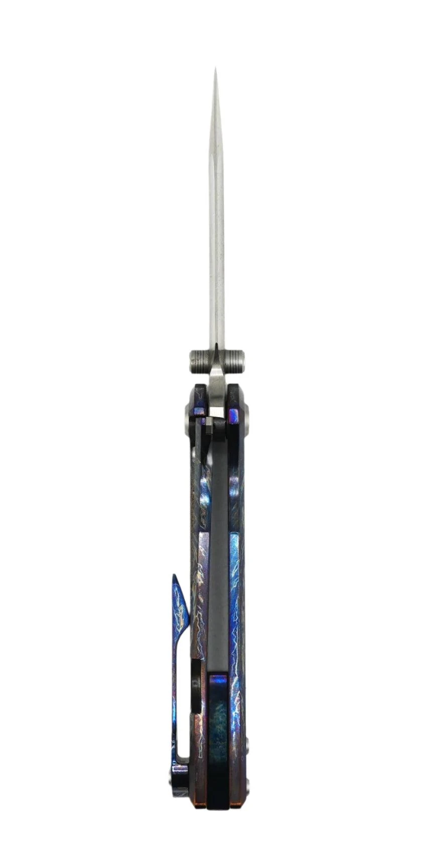 This Chaves Redencion Street is one of a kind and has been expertly heat anodized in blue lightning patterned handles with a beautiful clip to match. This meticulous process not only enhances the knife’s durability and functionality, but also adds a touch of sophistication and exclusivity to its ownership. No pattern is the exact same between any of these heat anodized knives.