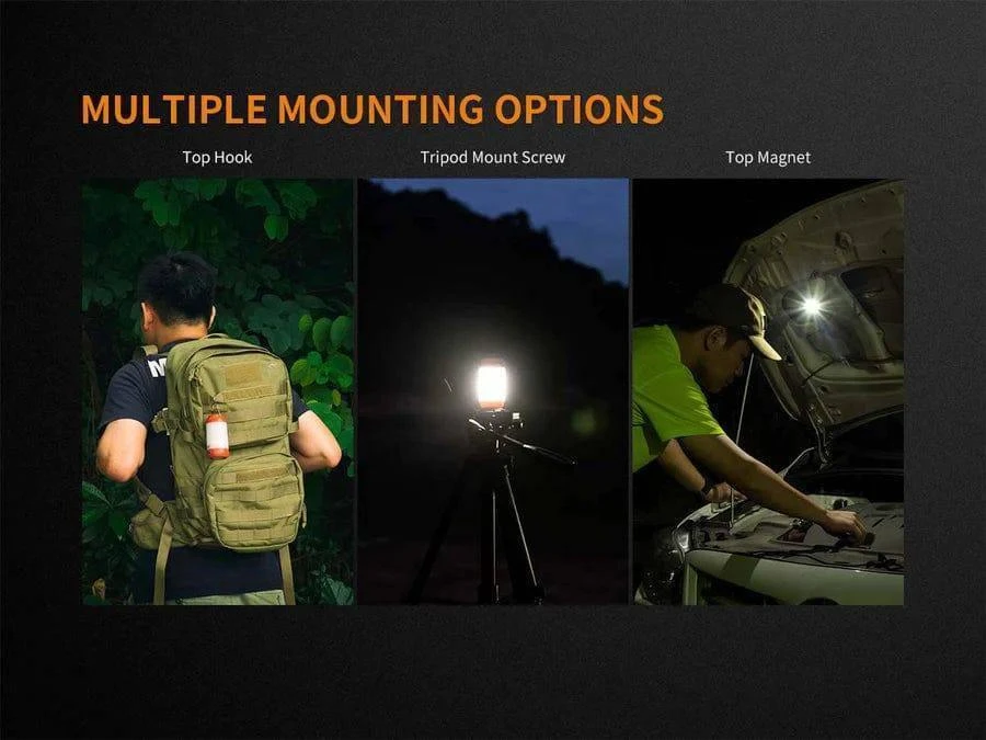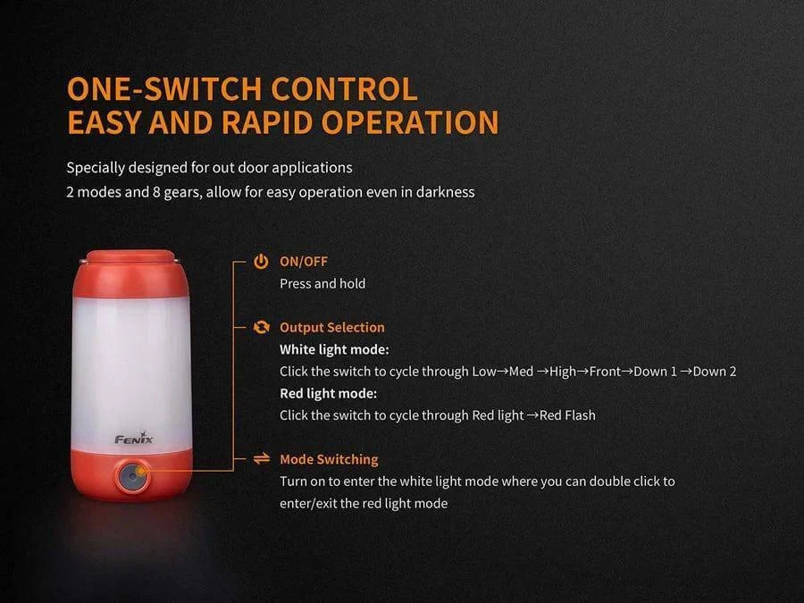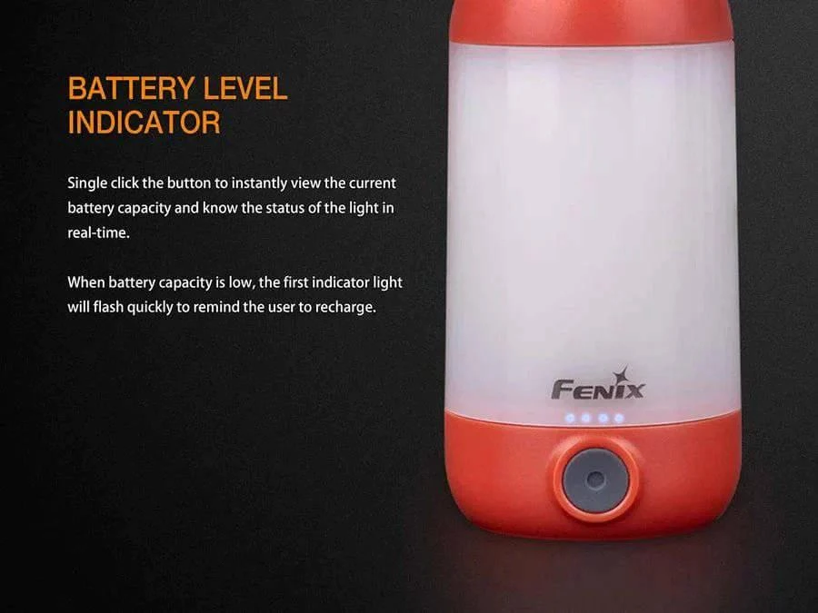 The Fenix CL26R Rechargeable Lantern is a multi-directional, lightweight camping lantern. Powered by a rechargeable 18650 battery, this lantern delivers a max output of 400 lumens—plenty of light to illuminate your entire campsite. A unique feature of the lantern is the multi-directional lighting modes—three brightness levels of 360° light, a front light and two brightness levels of down light. Unique heat distribution allows for outstanding cold performance. The Fenix CL26R Rechargeable Lantern is extremely durable and rain-resistant making this lantern a perfect camp companion.