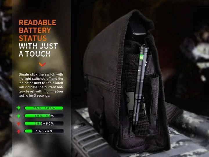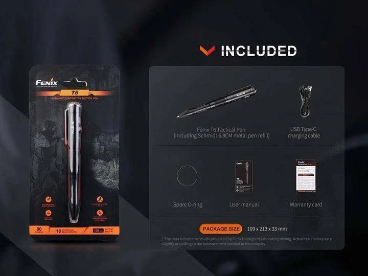 The Fenix T6 Penlight is not only an exquisite writing instrument, but it’s also designed to be used as an EDC flashlight. The built-in flashlight allows you to have up to 80 lumens of light when you need it. The silicon nitride bead on the tail can be used to break glass in an emergency. The Schmidt ink cartridge makes writing smooth and effortless. Made of A6061-T6 aluminum, this penlight is built tough, and can withstand hard impacts and is dustproof and heavy splash resistant. The Fenix T6 is sure to become your favorite pen and EDC flashlight.