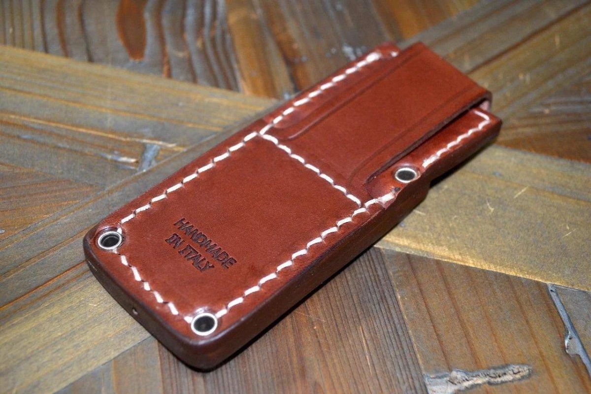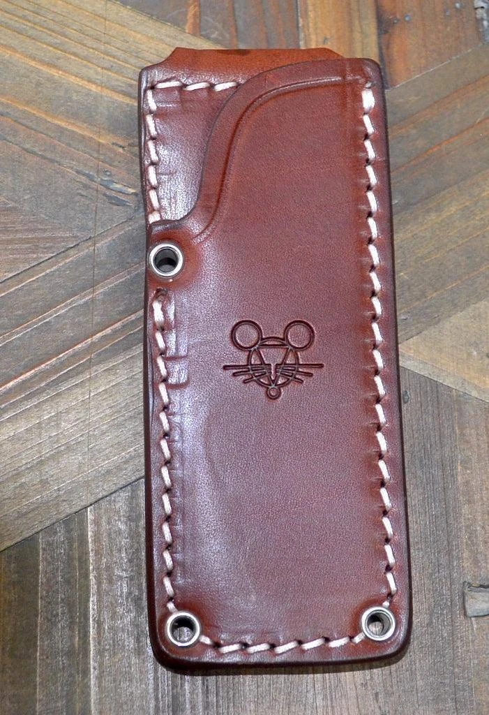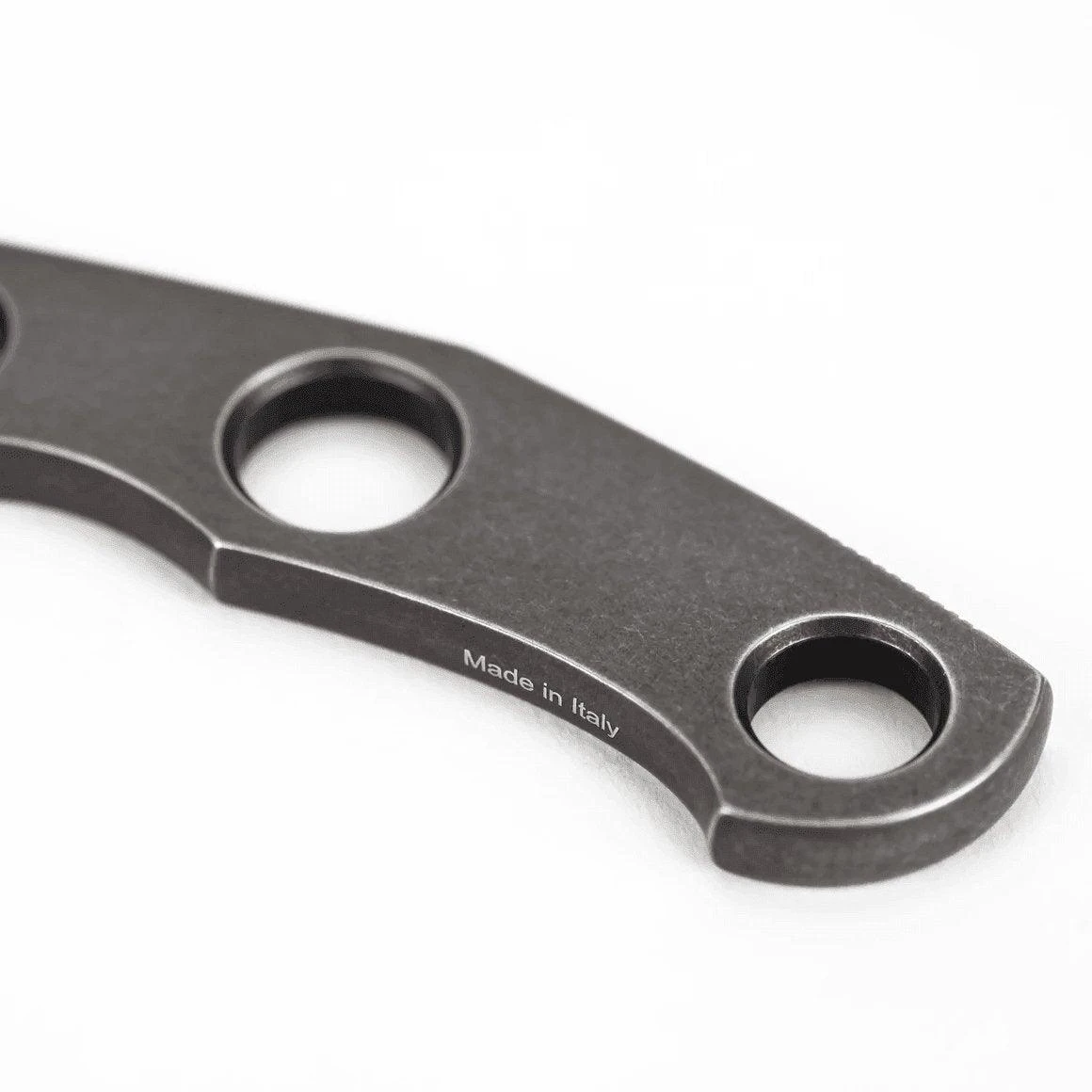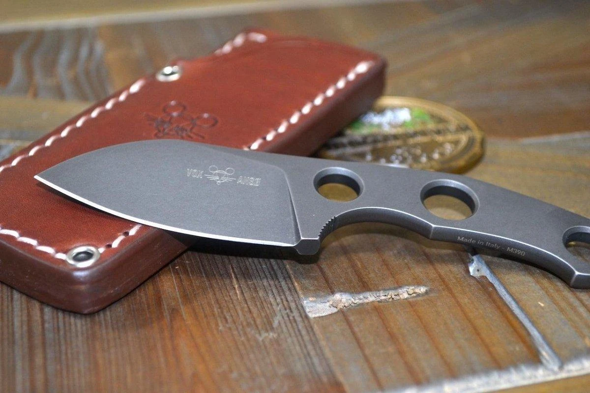 GiantMouse uses 5mm BÖHLER M390 STEEL for this new variation of the ever popular GMF1, and gave it our dark PVD stonewash treatment to create a beefy little utility fixed blade that will address any EDC cutting need that comes your way. Three separate areas of jimping ensure a solid grip no matter what your chore. The rounded spine and beautifully chamfered holes in the handle add elegance to an otherwise extremely functional cutting tool. Each GMF1-F comes with a handmade Italian leather sheath designed by Ansø and Vox specifically for this knife.