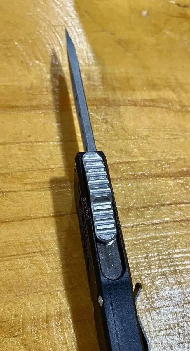 The Guardian Tactical GTX-025 OTF Auto Knife (2.5″ Stonewash) 12-3511 boasts a stonewashed drop point blade and sleek black aluminum handle. This compact OTF offers a highly responsive action, top-quality blade steel, and an attractive design. The blade features a milled fuller and strategically placed weight-reducing holes to minimize felt recoil when opening. The ceramic bearings ensure minimal friction for a smooth and efficient motion. Ideal for everyday carry, the 025 is a must-have for any knife enthusiast. Don’t miss out – get yours now!