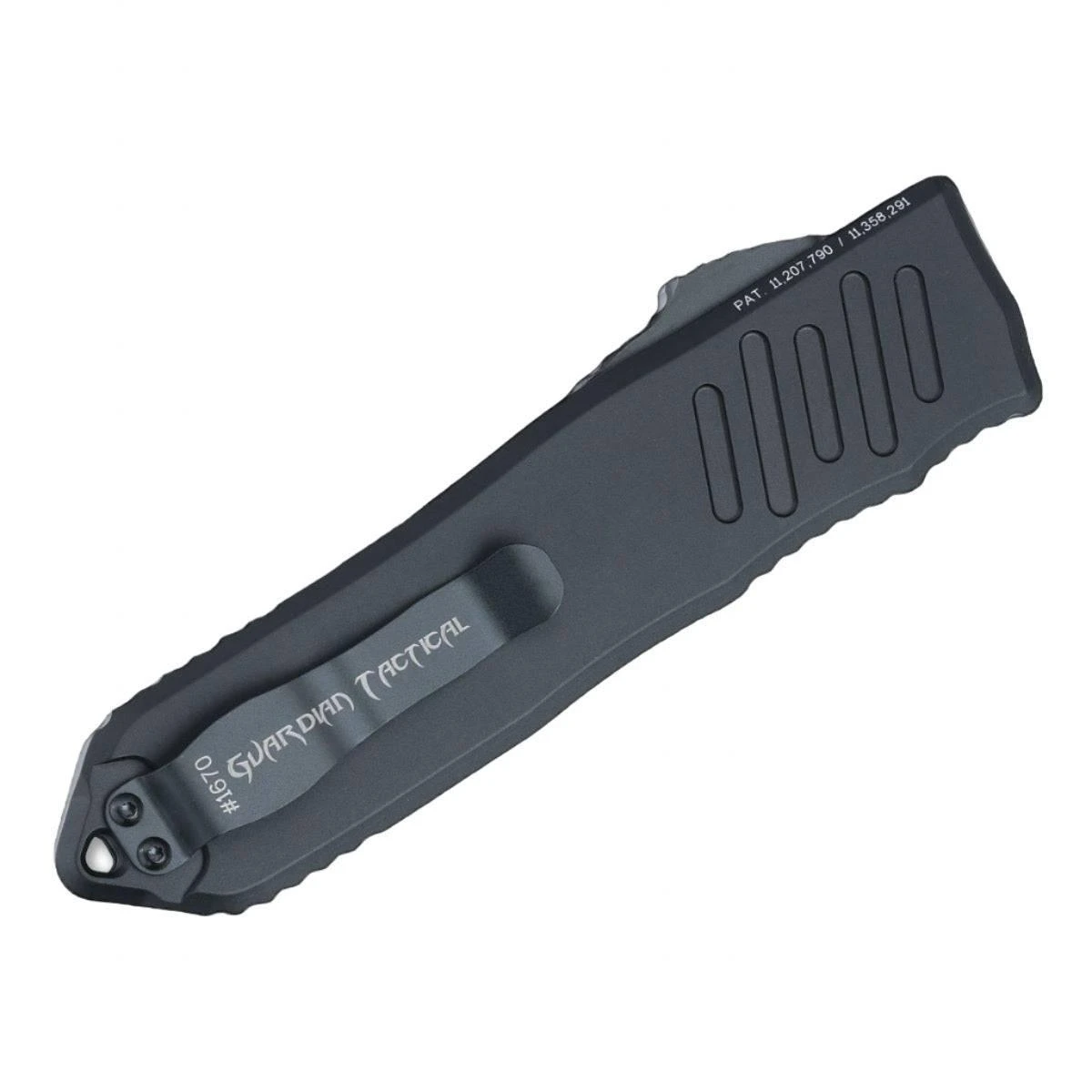 Guardian Tactical RECON-040 is the top-of-the-line and state of the art OTF automatic. This is the latest RECON model and built with a black anodized handle and a two-tone, drop point blade and stonewashed clip.