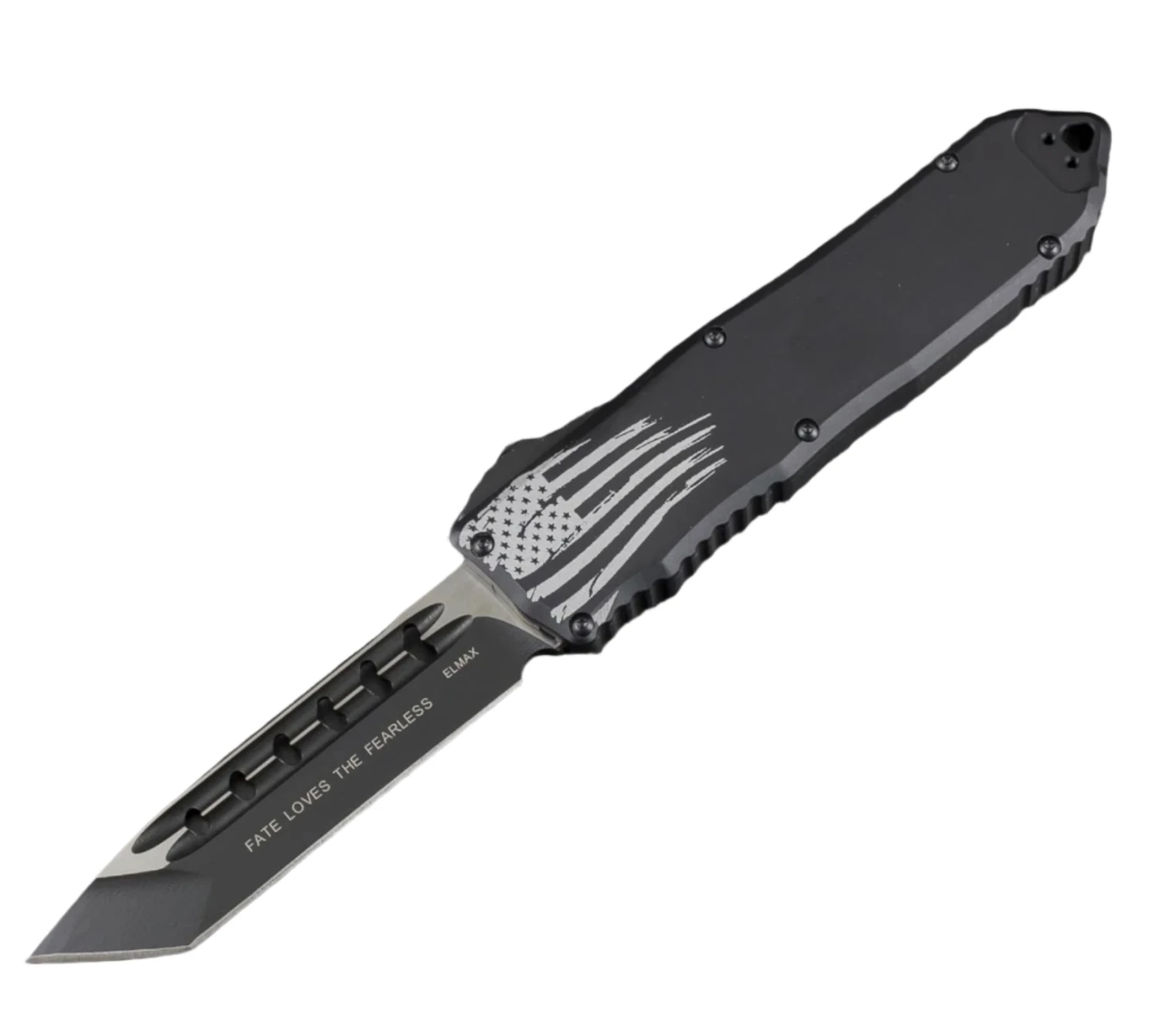 The Recon-Elite Double-Action Automatic measures 9.75” overall and 5.625” when closed. Its 4.1” Tanto-point blade, crafted from black-finished ELMAX stainless steel, features dual ventilated blood grooves for rapid deployment. The black Type III Hardcoat Anodized Aluminum handle includes top and bottom jimping to ensure a secure grip. The black thumb slide glides smoothly on a stainless steel plate with ceramic balls to minimize friction. Equipped with black hardware and a serial-numbered, reversible pocket clip for right or left tip-down carry, it also offers a lanyard hole and a hardened glass breaker tip for added versatility.