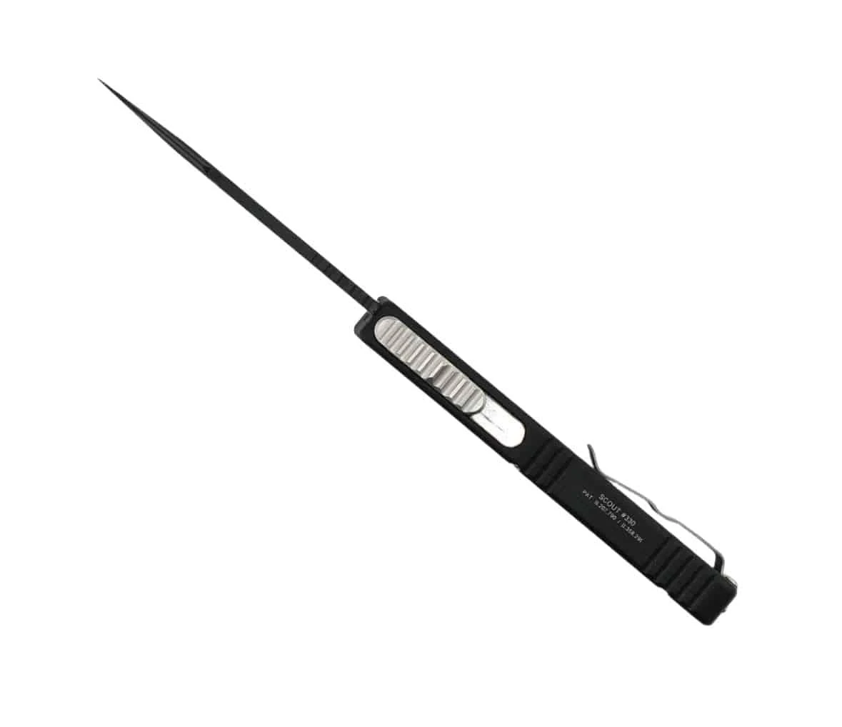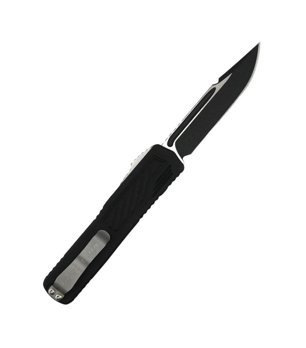 The Guardian Tactical Production Scout is the budget-friendly version of the carbon fiber model. Smaller than a Recon-035 and bigger than a 025, the Scout hits the EDC sweet spot. Think slim upgraded 035. Black aluminum handles make for a sleek-looking carry. A wicked clip point blade offers great piercing power and plenty of belly for slicing. The Scout is a great knife for anyone wanting a compact OTF with big cutting power.