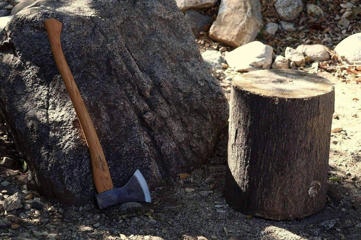The Hessen Woodworker is a midsize, traditional German cutting axe, light enough for any user to handle comfortably. The 2 ¾ lb Rheinland pattern axe head has a sharp, slim, wide-bit blade that will outperform most American pattern felling axes at cutting work. The pattern is named after Germany’s famous Rhein River Valley, a heavily forested region where cutting axes like these have been in use for centuries. This axe is suited for felling small and medium sized trees, and can also be used for splitting smaller firewood. Slightly too big to carry along on weight-conscious backpacking trips, the Hessen is better suited as a base camp axe, or for longer excursions where it can be stowed in a canoe, raft, or vehicle.