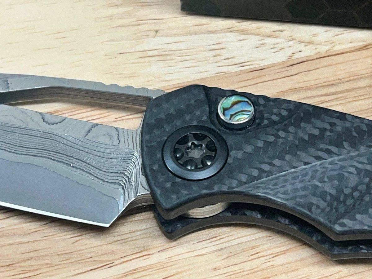 This is the limited-edition Blade Show Heretic Custom Pariah Manual V2 Wood Grain San Mai Carbon Fiber Knife with Abalone Inlay in Magnacut. Released exclusively at Blade Show 2023, this model is sure to impress.