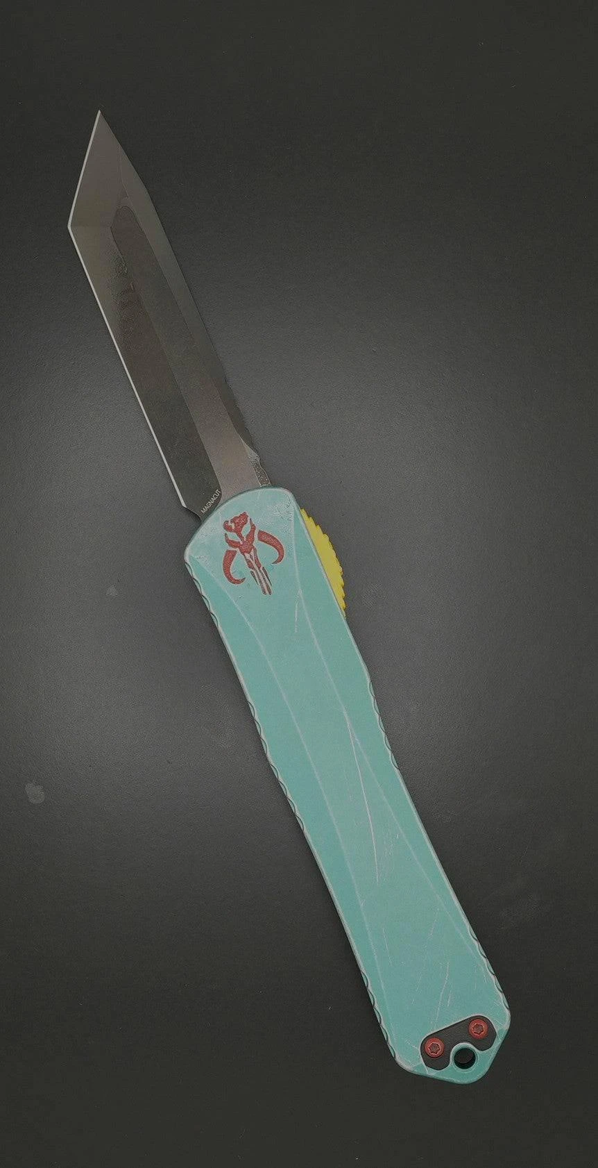 - Smooth green aluminum and carbon fiber handle with a bounty hunter insignia.
