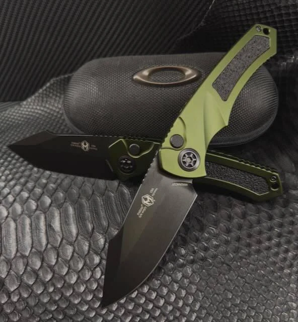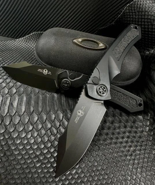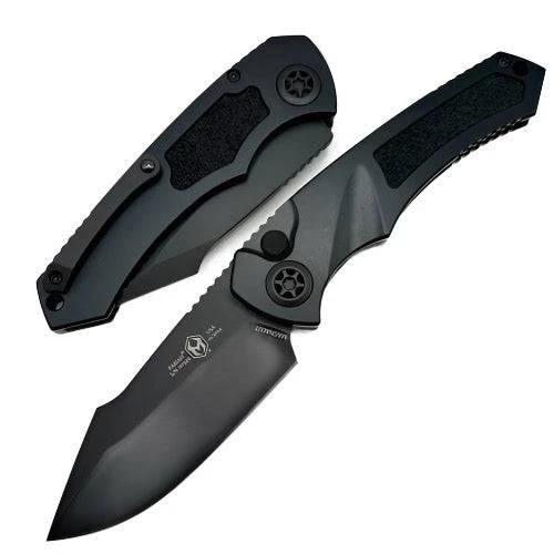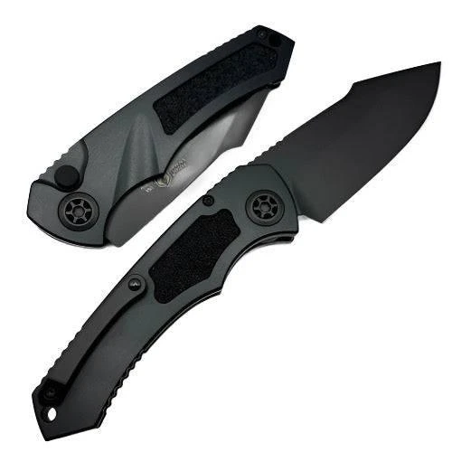 The Heretic Pariah H048-5A MagnaCut Auto Knife (USA) boasts a premium black handle with a flamed pivot, providing both durability and style. Made with an aluminum handle and board tape inlay, this US-made knife ensures quality and longevity.