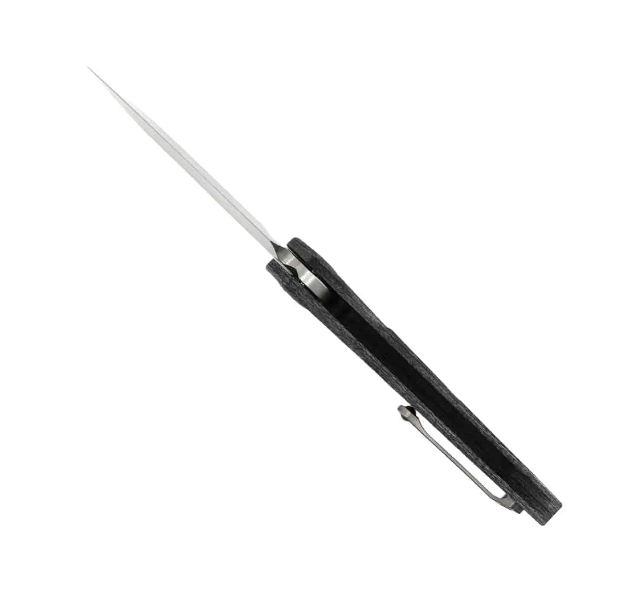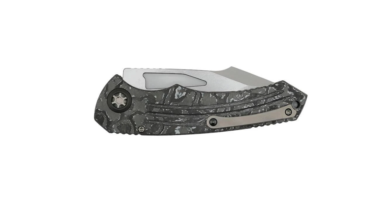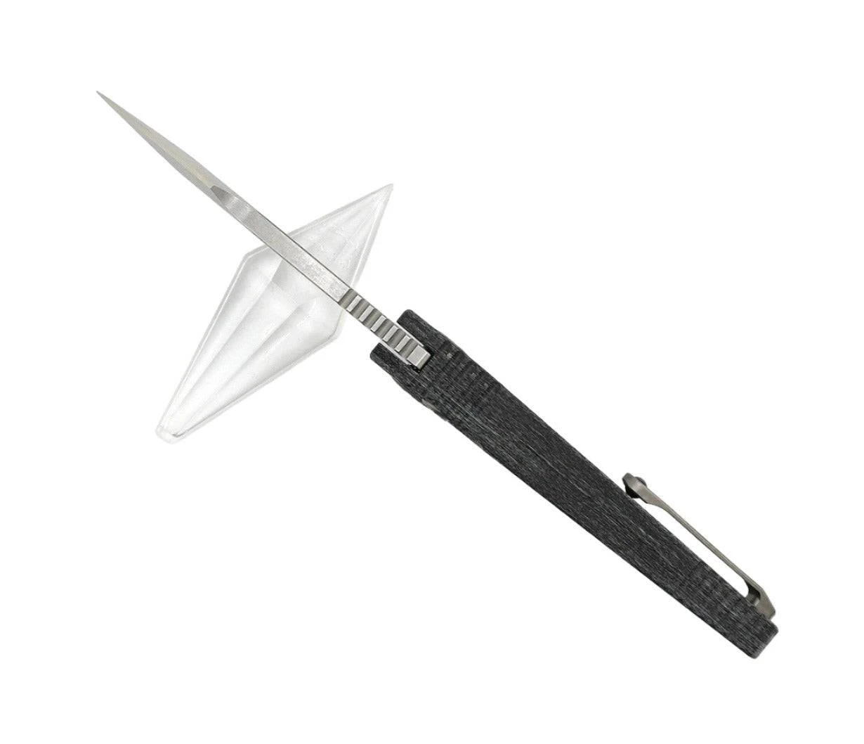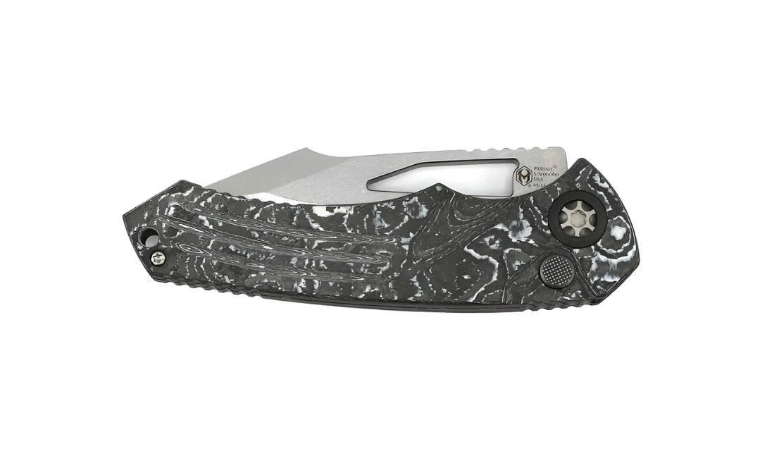 The word “pariah” means “outcast,” which implies a knife that is unique and stands out—and the Pariah does stand out. It’s a heavy duty beautiful manual knife, featuring thumb studs and push button opener. Made of a limited run of white camp carbon fiber scales, this beautiful knife is perfect to place your fingers and palm grip the handle, ensuring no one and nothing will take it out of your hand until you’re ready. The piece comes complete with a ball-ended pocket clip for everyday carry.