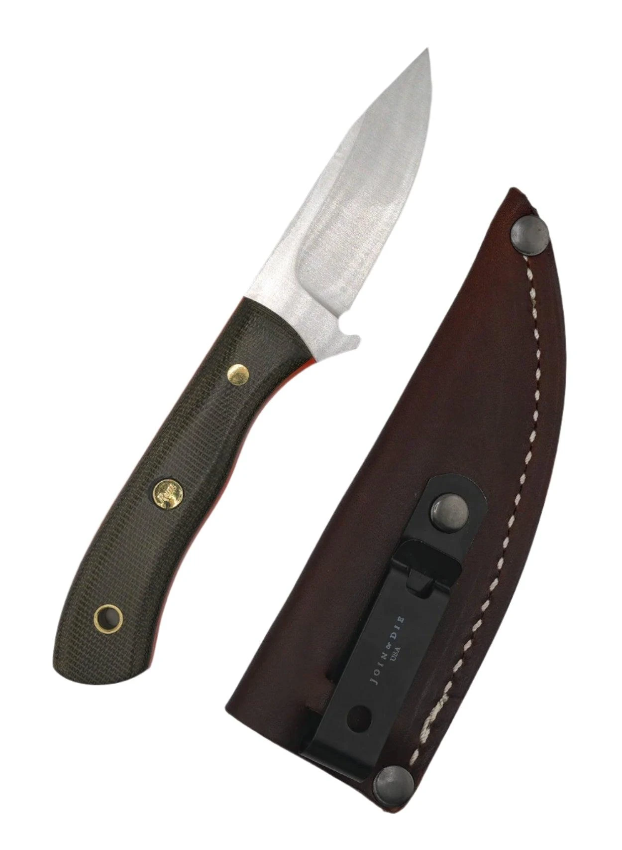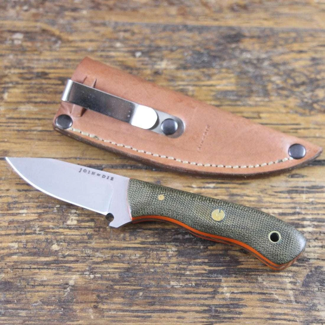 Local to Virginia, Check out this 2.5″every day carry knife is made from Nitro-V Stainless steel and cryogenically treated for added strength and hardness. Handle material come in different variances including this popular Green Canvas Micarta and Blaze Orange G-10 with Brass Pins and .22 Shell Casing Rivet. Each knife comes with a hand made natural leather clip sheath for easy pocket carry.