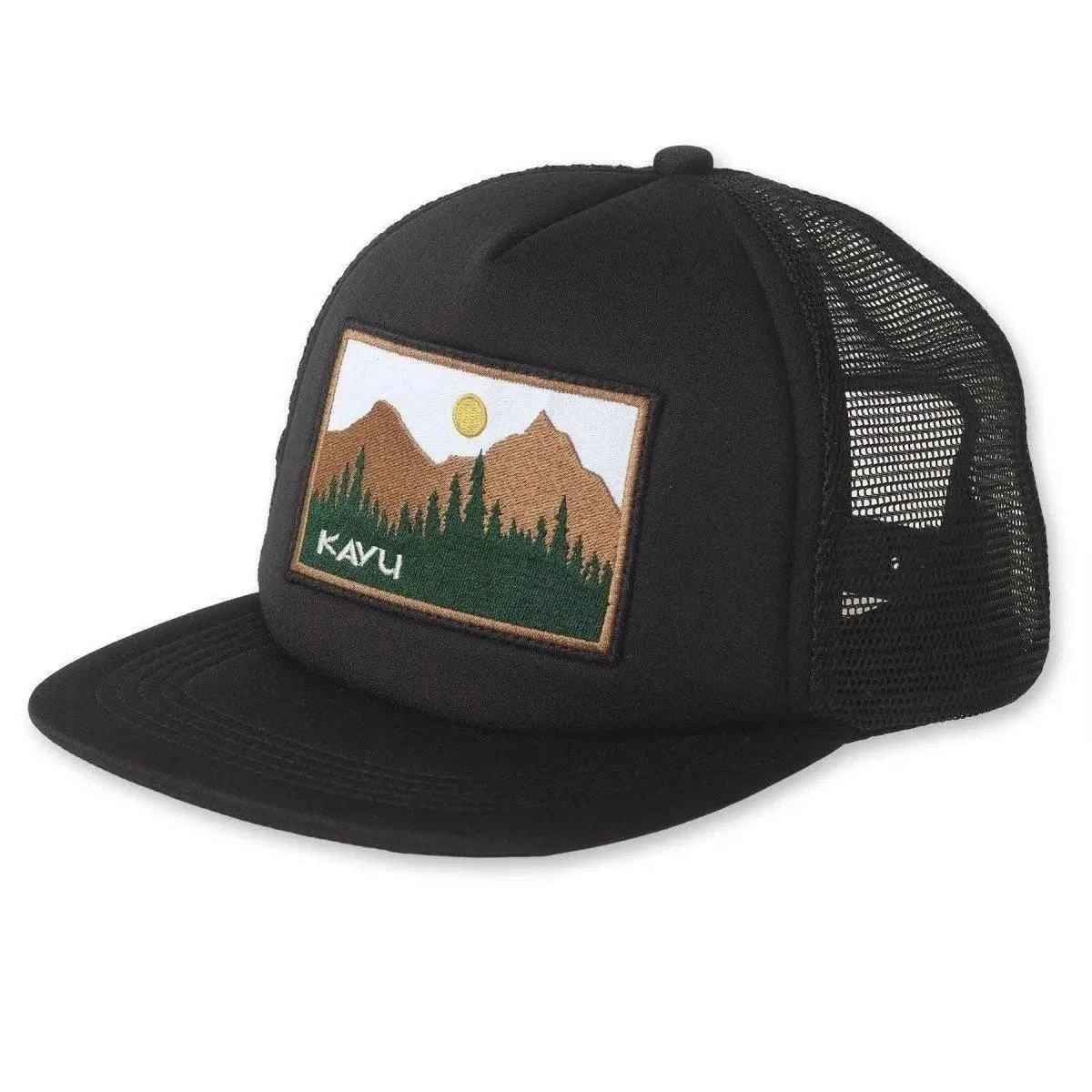 5 panel trucker, KAVU embroidered patch on foam front, foam bill shipped flat but can adjust, mesh back with adjustable snap closure, interior moisture absorbing sweatband.