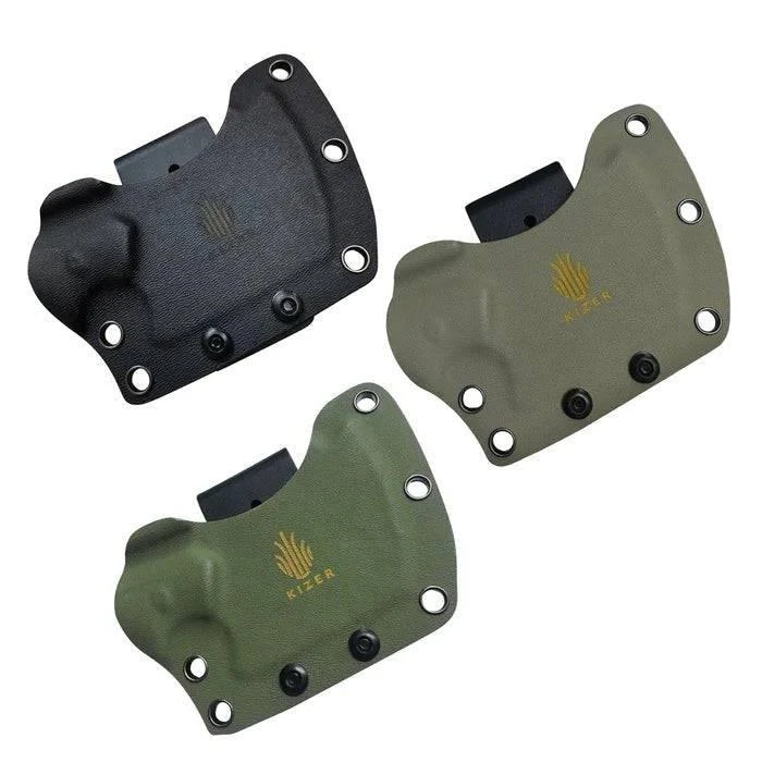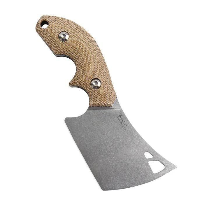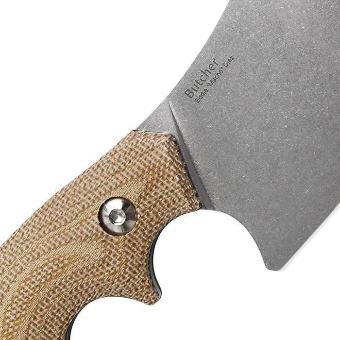 The Kizer Butcher is a compact fixed blade cleaver designed by Eddie Diaz of Macho Blades. The blade is just 2.5″ with an overall length of 5.67″. The cleaver-style blade has a unique upswept spine to give a unique look. The fit and finish of the Micarta handle scales are excellent with pronounced finger grooves for a secure, comfortable grip. The included coyote tan molded Kydex sheath includes a horizontal carry belt clip for easy carry.