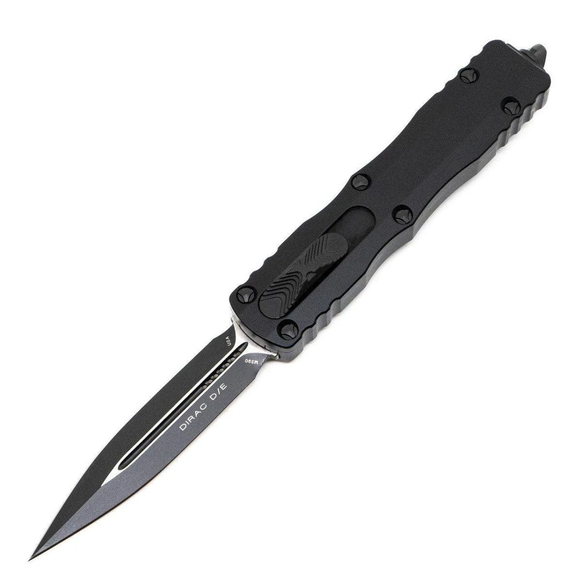 Discreet All Black Tactical Dirac Blade and Hardware. This The Dirac is the first Microtech double action knife with a cover firing slider. The extremely ergonomic chassis features curved lines similar to the HALO for a slightly different feel, compared to other handles. They researched this particular OTF design and applied their signature ultra-high tolerance Microtech features such as proprietary hardware, innovative internal mechanism, and glass breaker. With an overall length of 7.25 inches, the Dirac is just right for an everyday knife.