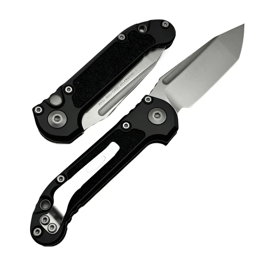 This model features a black anodized 6061-T6 aluminum handle with black 3M grip inlays. Apocalyptic finished M390MK stainless steel taint blade with a standard cutting edge. Torx hardware and tip up pocket clip. The blade is marked with the model information and Microtech logo. The pocket clip is also marked with the Microtech logo. Brand new in box.