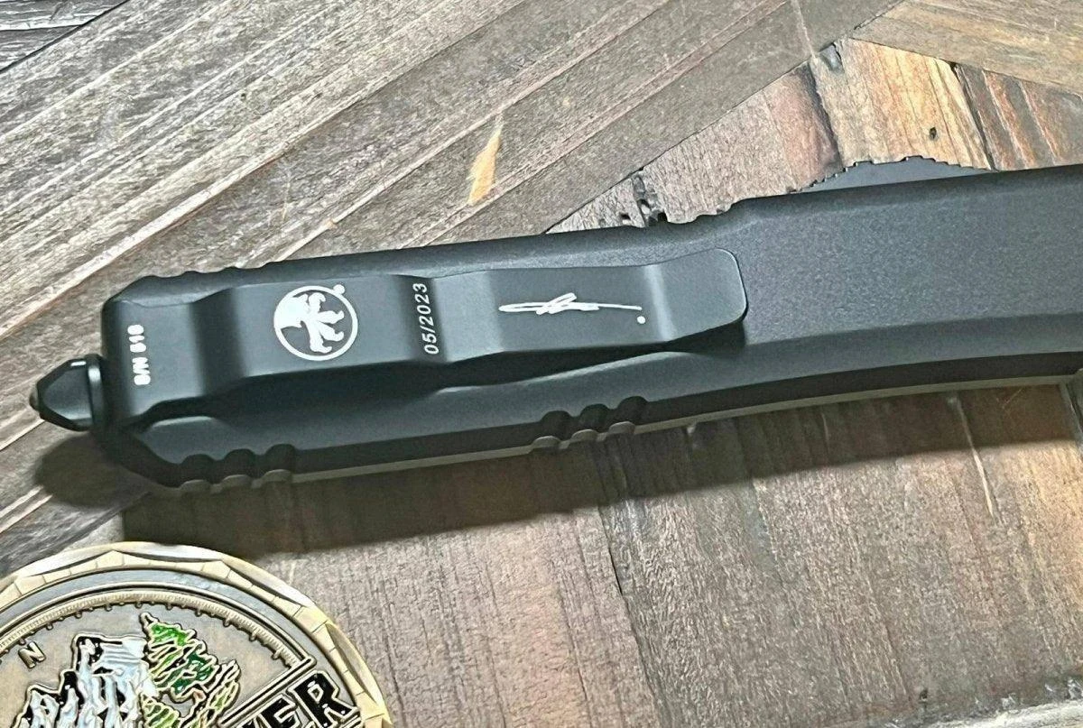 This Signature Series model has OD Green Frag G-10 Top and black finished aluminum back handle scales. Black finished M390 stainless steel single edge blade with partial serrated cutting edge. Black finished hardware, lanyard hole, glass breaker, and pocket clip. The clip features the Microtech claw logo,Signature Series logo, serial number, and production date. Brand new in box.