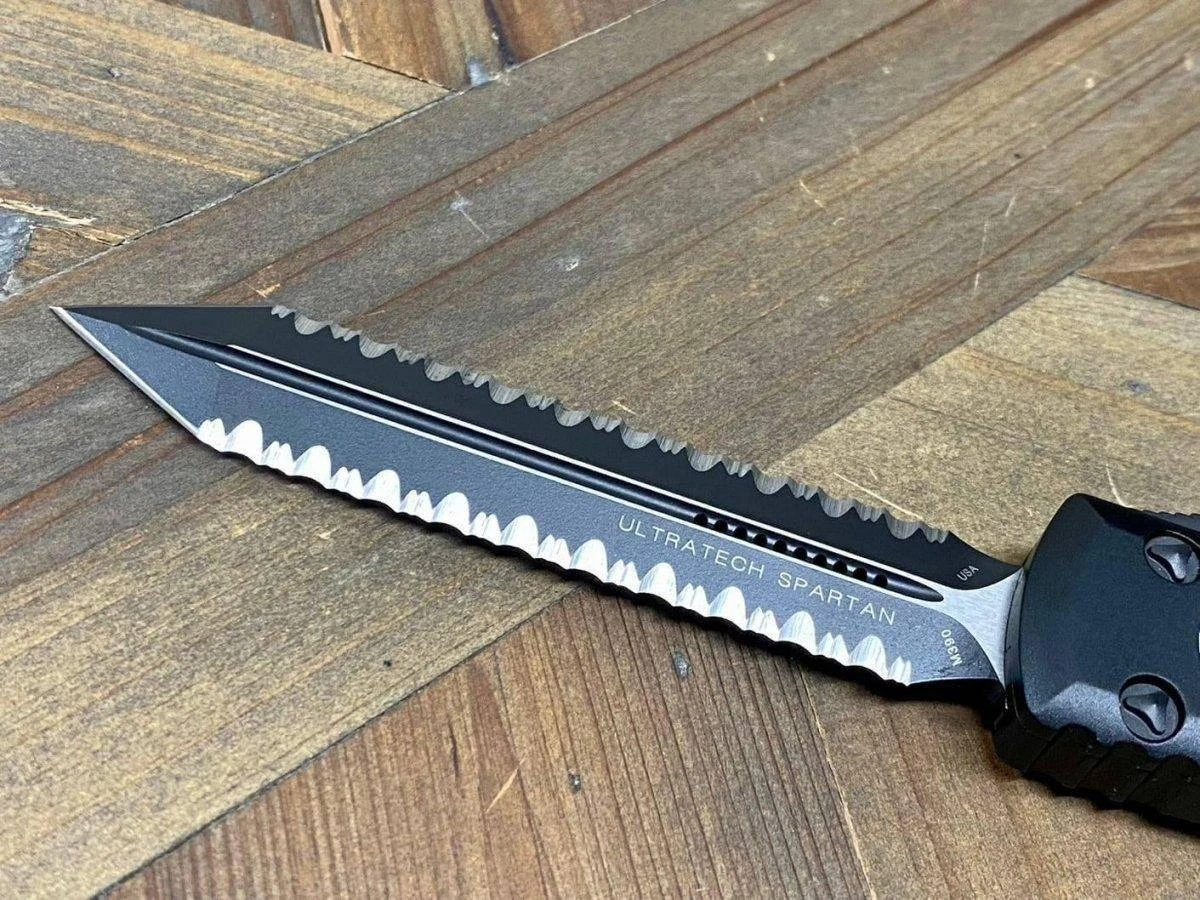 The Microtech Spartan Ultratech handle is making noise in the knife world. The Double Edge Tanto blade is quite appealing and offers a new blade style that could be the norm for MT. The dual action spring loaded OTF that started it all is the smoothest operating out the front knife you will find. It features a 3.4″ Spartan (double edge tanto) with double full-serrated blades. The Spartan Ultratech has a 5″ black anodized 6061-T6 aluminum bottom handle with black finished pocket clip, glass breaker and hardware.