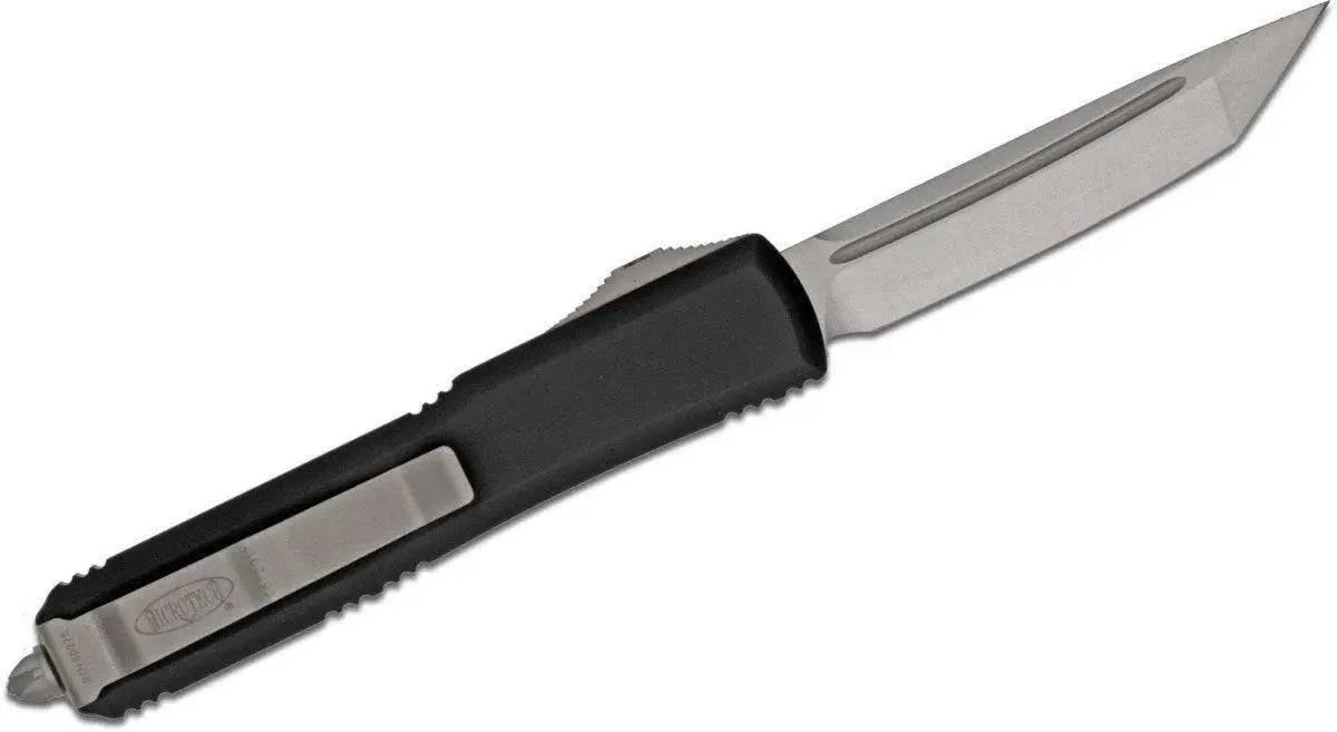 This Microtech Ultratech features a tanto blade with a stonewashed finish and a plain cutting edge. It has a contoured, black anodized 6061-T6 aluminum handle with a bead blast finished pocket clip, glass breaker, and stainless steel hardware. Microtech equipped this version of the ever popular Ultratech D/A OTF knife with a smooth, contoured handle design that promotes increased comfort during use. This updated model provides the same dimensions, hardware, and durability offered by the “Tri-Grip” variation, but goes easier on the hands and pockets. For those unfamiliar with the Ultratech, it’s a fully automatic knife with a double-action out-the-front mechanism, meaning the thumb slide deploys the blade and retracts it as well. Made of the highest quality, this Ultratech knife from Microtech has set the bar for all OTF knives.