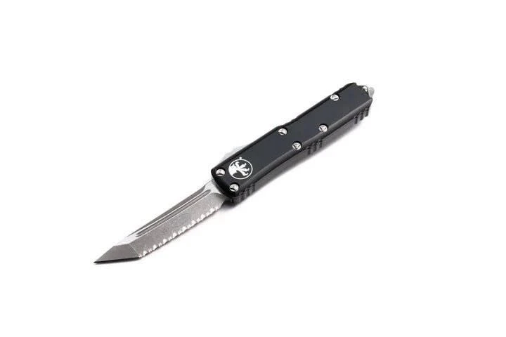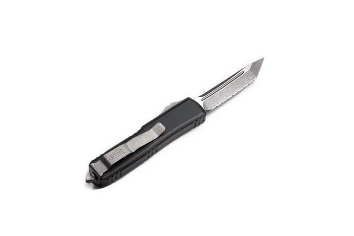 Microtech 233-12 UTX-85 Stonewashed Tanto Serrated Blade, Black Aluminum Handles