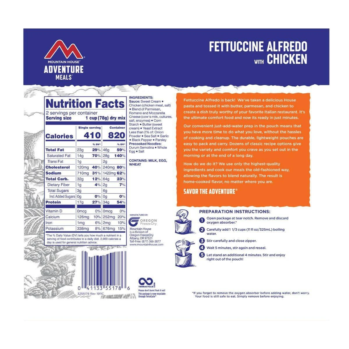 - DELICIOUS MEAL! Premium Fettuccine Alfredo with Chicken Meal. Freeze-dried to lock in nutrients and freshness. No refrigeration needed.