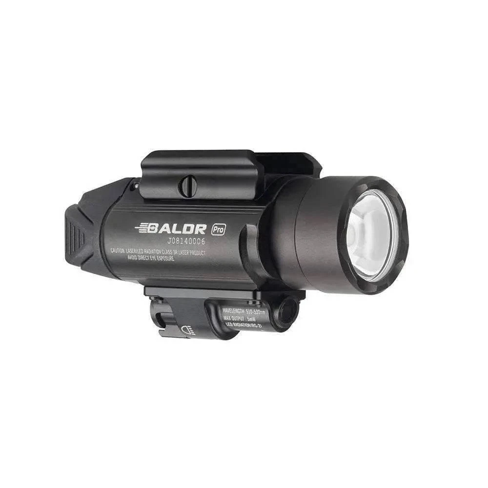 The Baldr Pro is a professional lighting tool with green laser sight and white LED for installation on equipment. Powered by two CR123A batteries, the max output of the Baldr Pro is 1350 lumens.