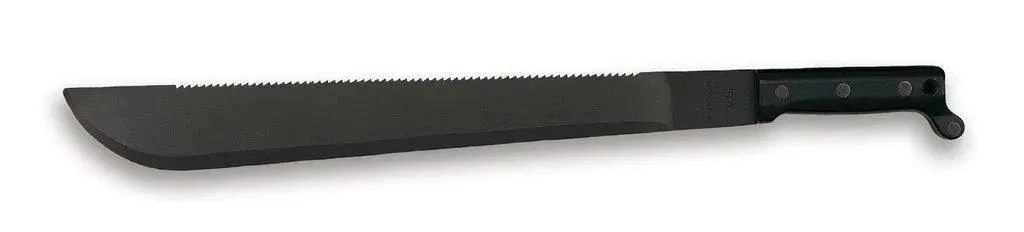 Ontario Sawback Machete. 18″ carbon steel sawback blade with black zinc phosphate finish. 23-1/4″ overall. Black high impact shatterproof polymer handles. Scabbard available separately.