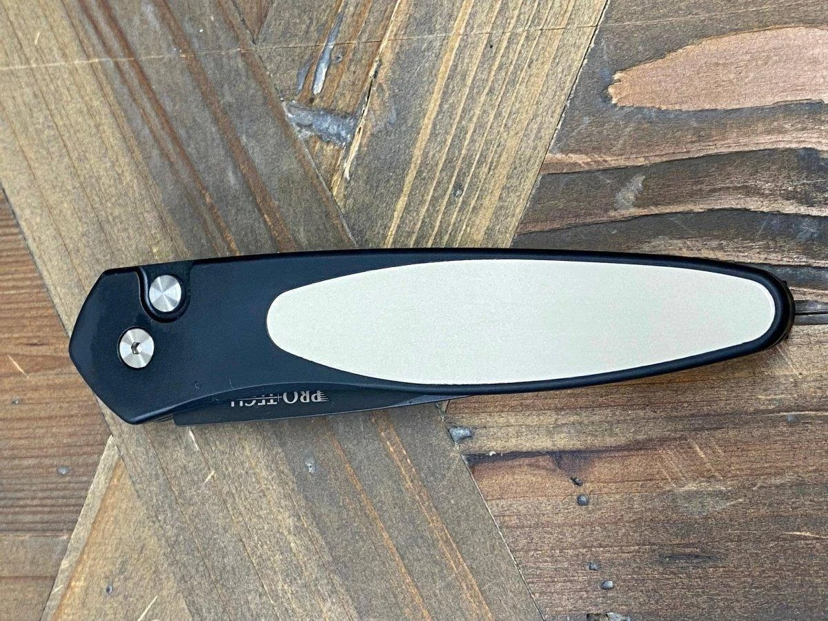 Pro-Tech Knives is proud to be the first choice of Police and Military professionals around the world. Pro-Tech Knives are built to serve and serve well. The Newport is a thin, sleek side opening AUTO with a 3″ blade made from CPM-S35VN stainless steel. It’s built along the lines of the Godson but with a more ergonomic and more easily carried handle. It functions basically the same as all non-OTF AUTOs from Pro-Tech; just depress the actuation button, then stand back and watch the show. The action is snappy, authoritative, and extremely pleasing. This Tuxedo model has a black DLC blade, black anodized aluminum handles, and an ivory Micarta inlay. Includes a deep carry pocket clip set up for right-hand, tip-up carry.