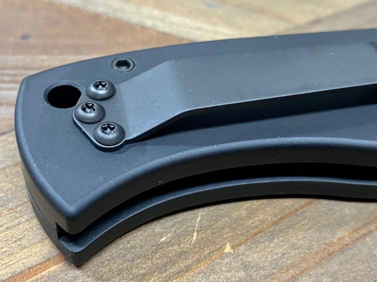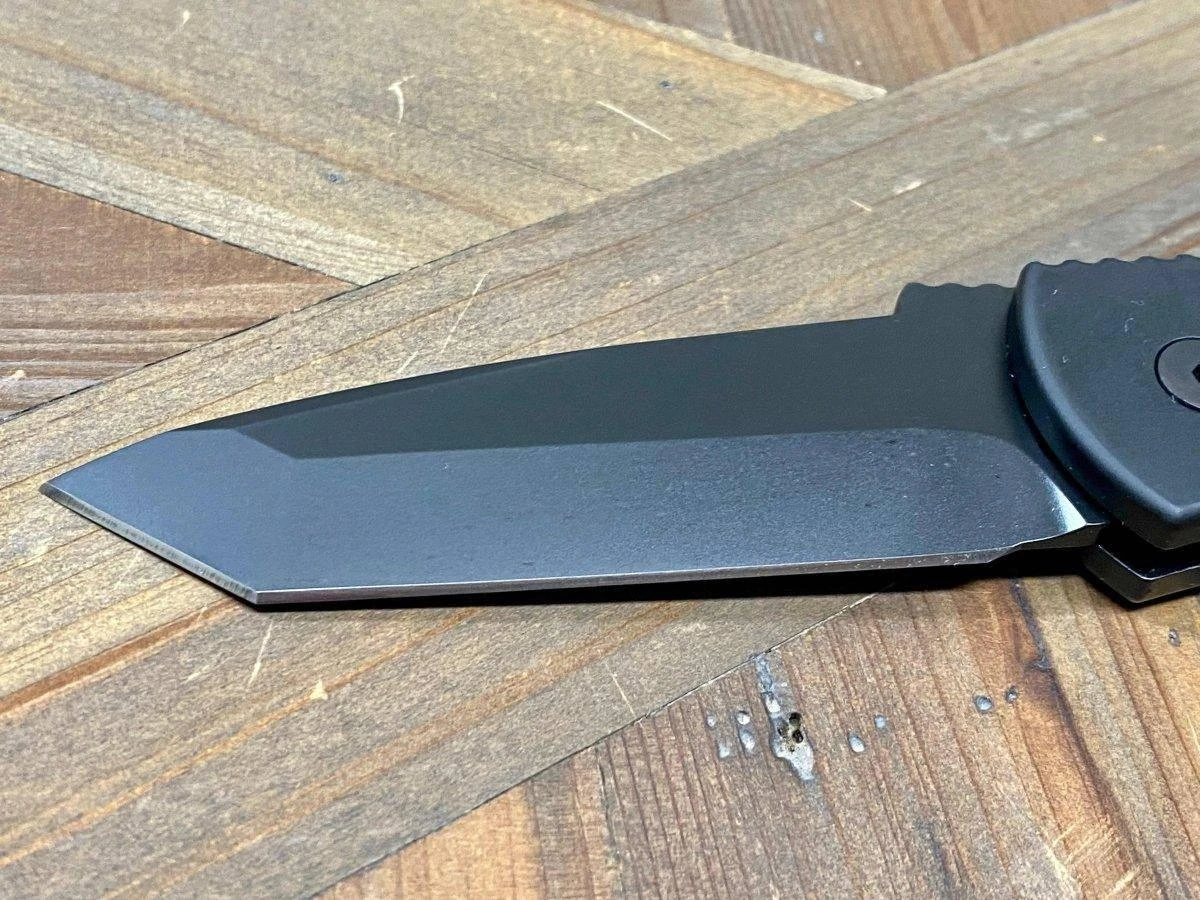 This knife has the Emerson CQC7 tanto blade with DLC black finished grinds and a satin flat. The black anodized 6061-T6 aluminum handle has the tritium button and all black hardware. Convenient carry with the tip-up carry pocket clip.