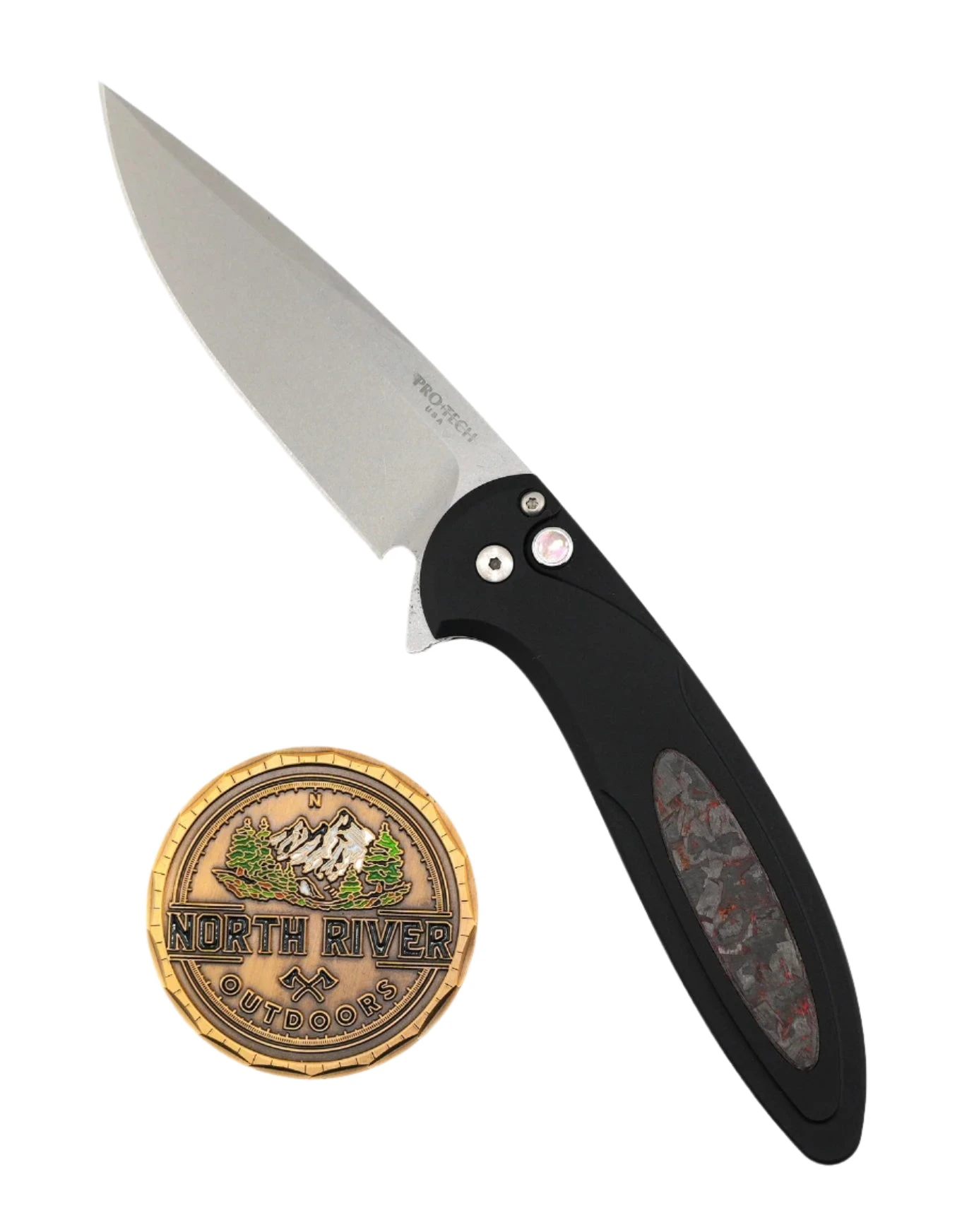 The Protech Cambria Manual Flipper CF2101-LTD TC Red features a black 6061 aluminum handle with TechnoCarbo Red inlay, a stonewash MagnaCut blade, a black lip pearl push button, with satin hardware, and a polished clip.