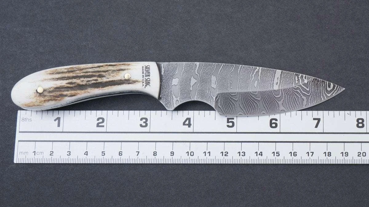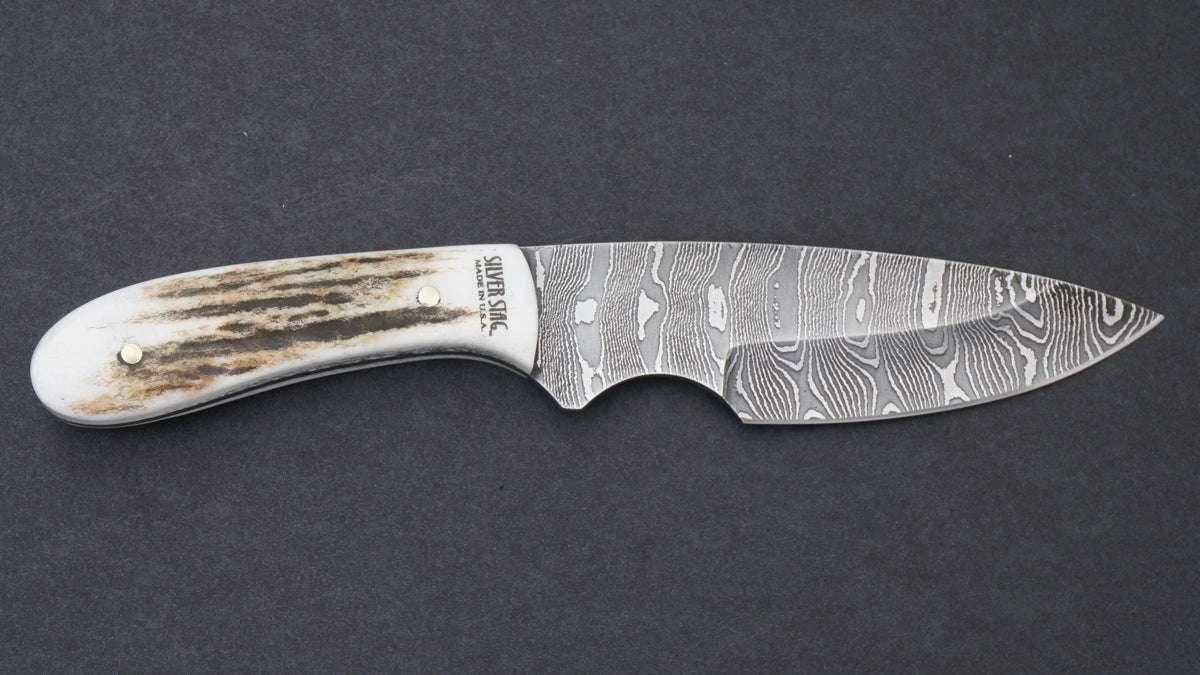 Features Damascus Steel Manufactured in Full-Tang construction. Elk or Moose scale slabs are cut, polished, and pinned through the blade tang to give the knife superb control and balance. The blades are heat treated to a 60 Rockwell Hardness. Our Slab Series Designs are guaranteed to provide the hardcore sportsmen with one of most practical and durable knifes ever used. These are a “must have” for the professional sportsman. A high quality leather sheath is included.