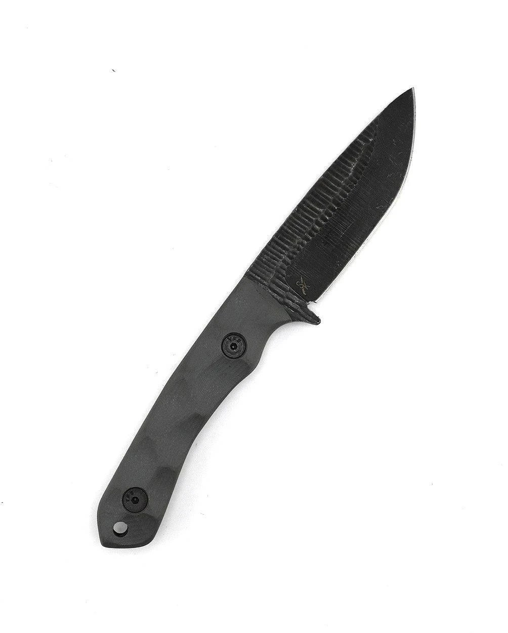 - Acid washed, hammer-finished drop point blade made from 1095 steel.