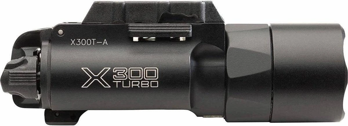 The X300T-A Turbo Utilizes a Turbo Reflector which Delivers 66,000 Candela of Light Popular with law enforcement and military operators around the world, SureFire’s best-selling pistol mounted light now comes in a Turbo model which delivers an incredible 66,000 candela of bright focused white light. A precision engineered Turbo reflector focuses the 650 lumen LED into a bright and tightly focused beam which can reach further than any other SureFire X-Series pistol mounted weaponlight. Ambidextrous switches provide one-finger control of momentary-on or constant-on activation. Its rugged, aerospace aluminum body is Mil-Spec hard anodized for scratch and corrosion resistance and sealed to make it weatherproof. It’s also IPX7 waterproof to ensure proper operation even in inclement weather conditions. The X300T-A Turbo utilizes a lever latch attachment which easily mounts to both universal and Picatinny accessory rails and makes an excellent light for duty pistols, home defense handguns, and everyday carry.