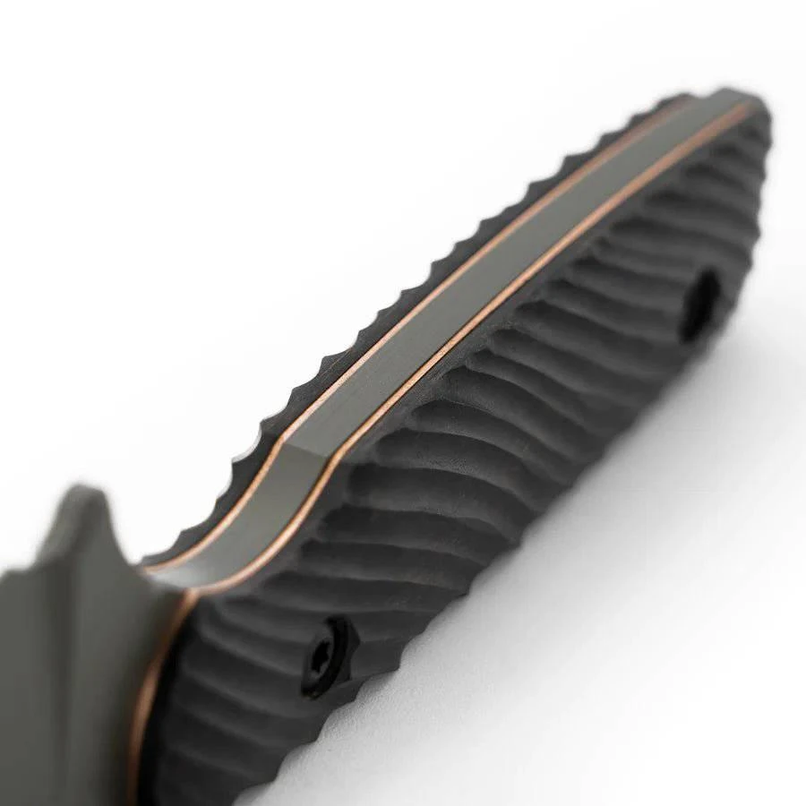 Every handle is lined with a polished copper accent, as well as Toor Knives’ proprietary multiaxial Dynamic Fluting texturing pattern, which provides smooth ergonomics in the hand and improves grip. This handle design flows perfectly with the hand’s natural positioning and concentrates all the pressure onto the apex of the blade’s edge.