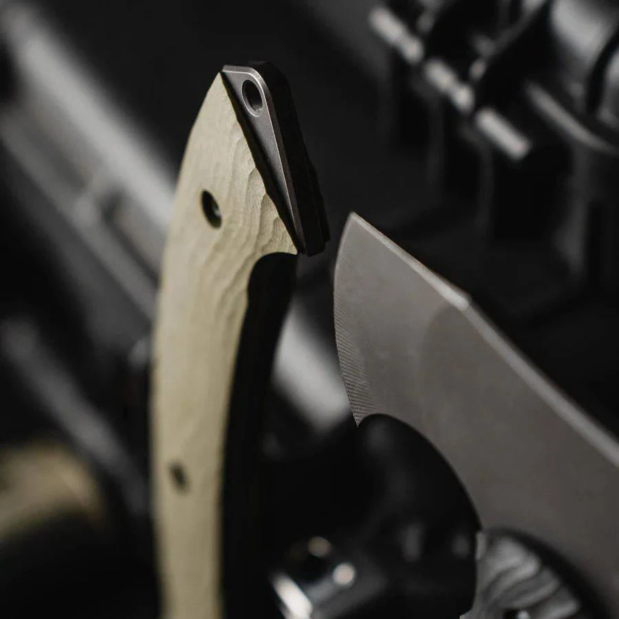 The unique double recurve handle allows for comfortable gripping at the bottom of the Tomahawk, as well as at the top, near the head. Additionally, it’s fitted with Toor Knives’ signature textured G10 handle and also features a corrosion-resistant KG Gunkote finish.