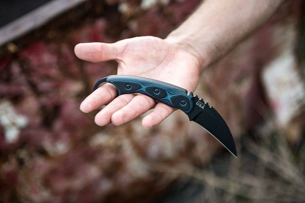 TOPS Devil’s Claw 2 Fixed Karambit 3.13″ Black Traction Coated Hawkbill, Blue/Black G10 Handles – DEVCL-02.