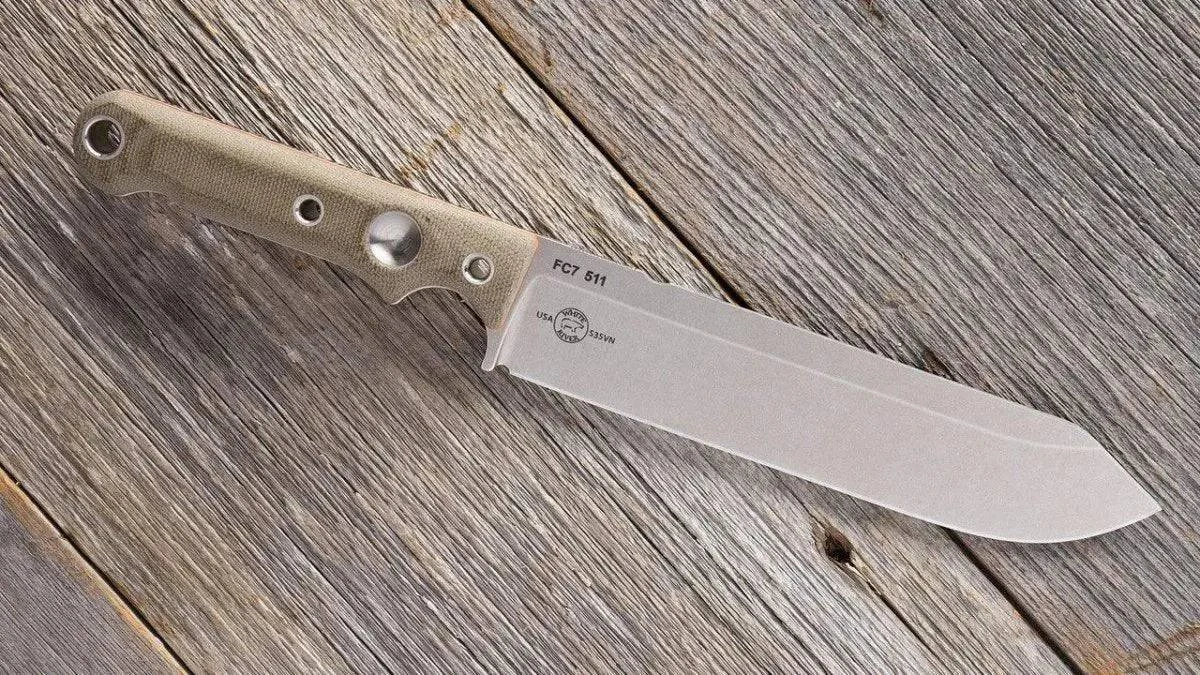 The White River FC7 Firecraft model comes equipped with a 7″ stonewashed S35V steel blade and an OD green micarta handle.