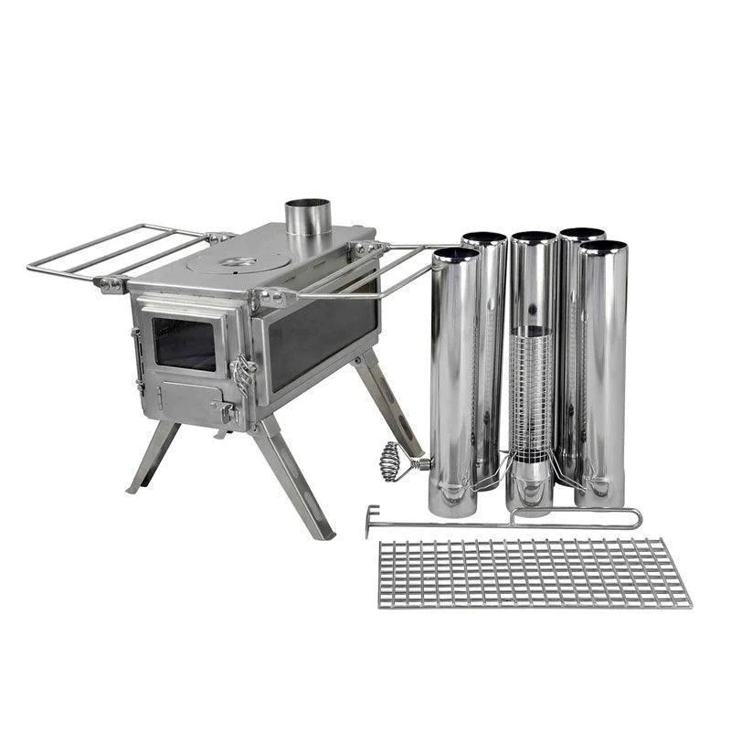 - Highly portable- Nesting legs and shelves fold flat to the stove body; 5 pipe sections, spark arrestor, and an ash scraper stow inside the stove body